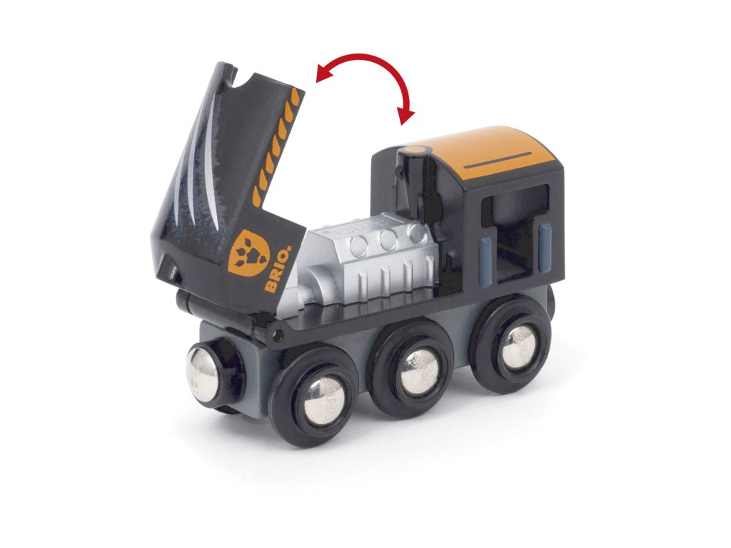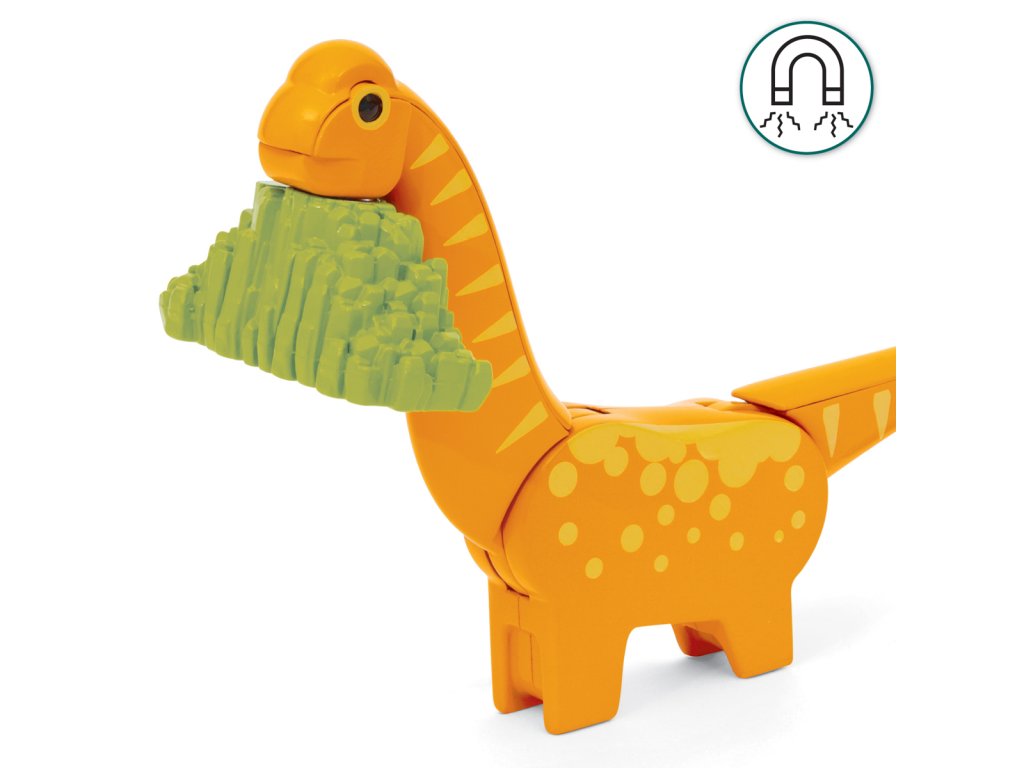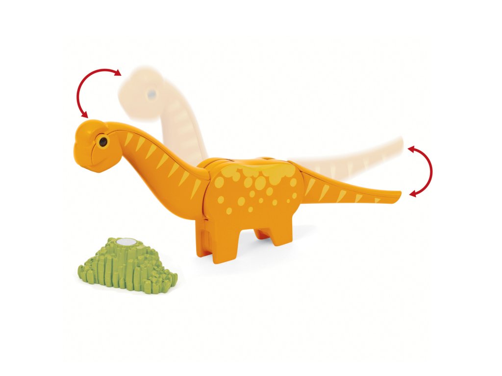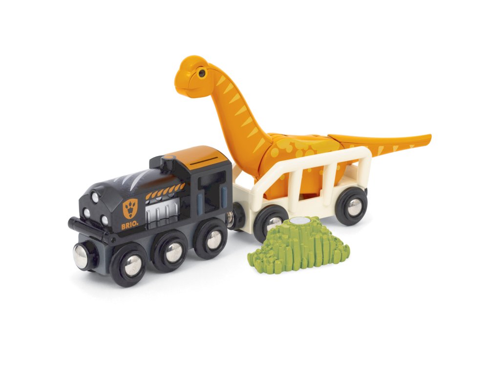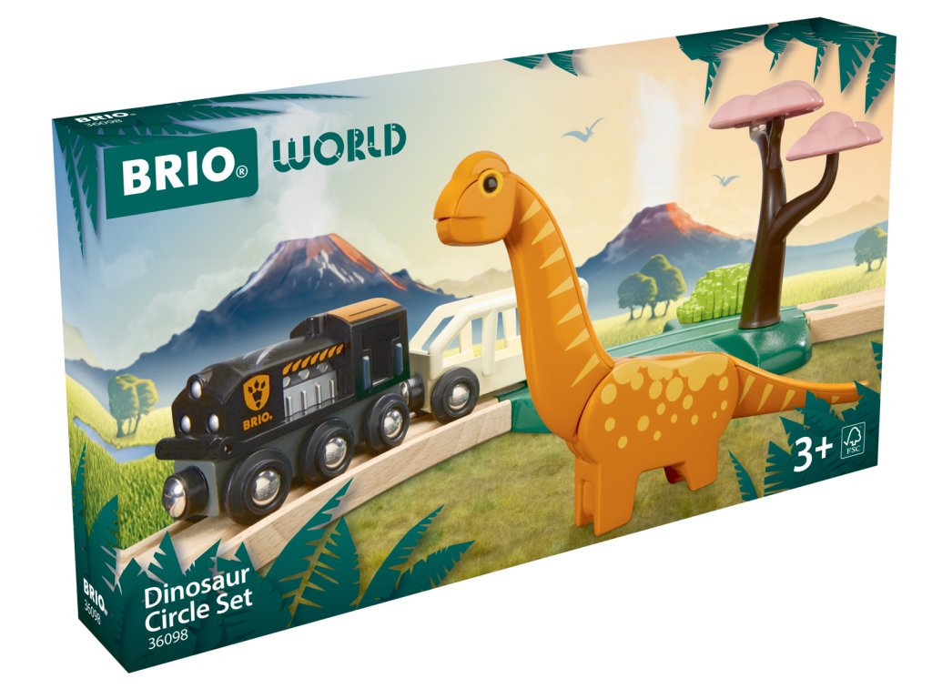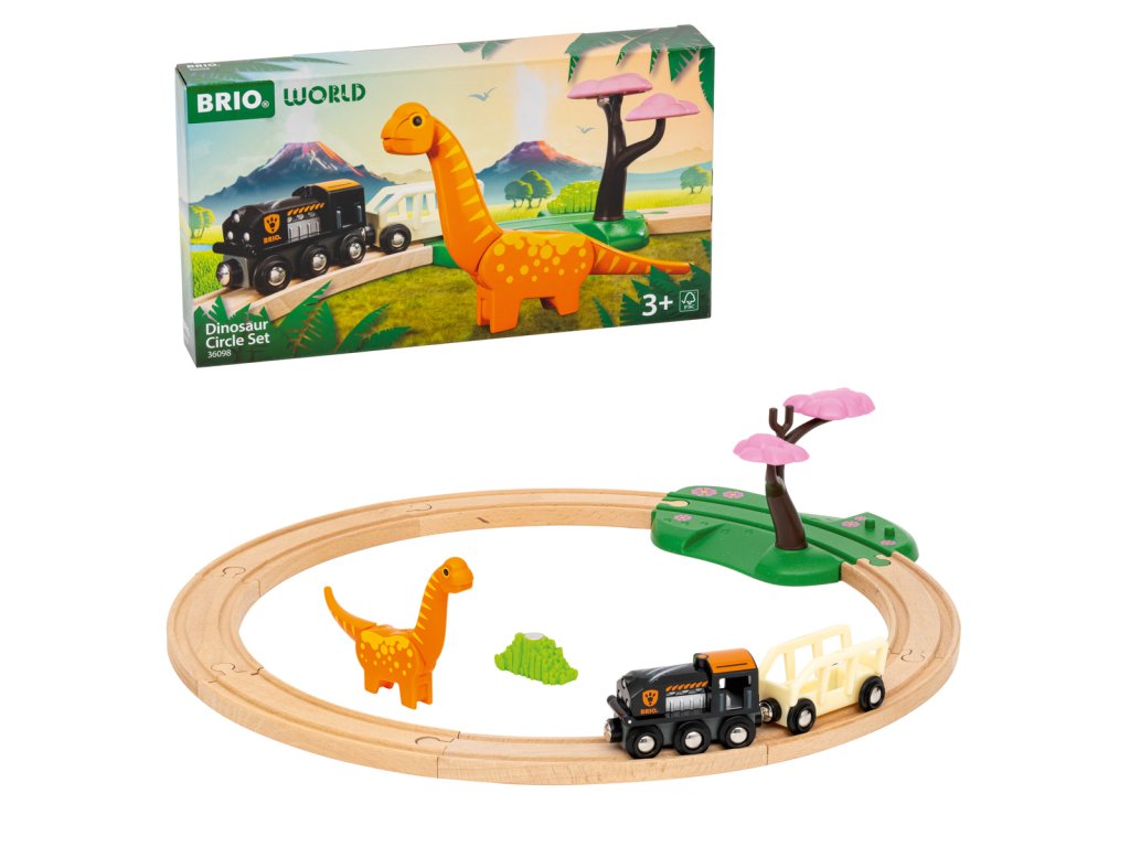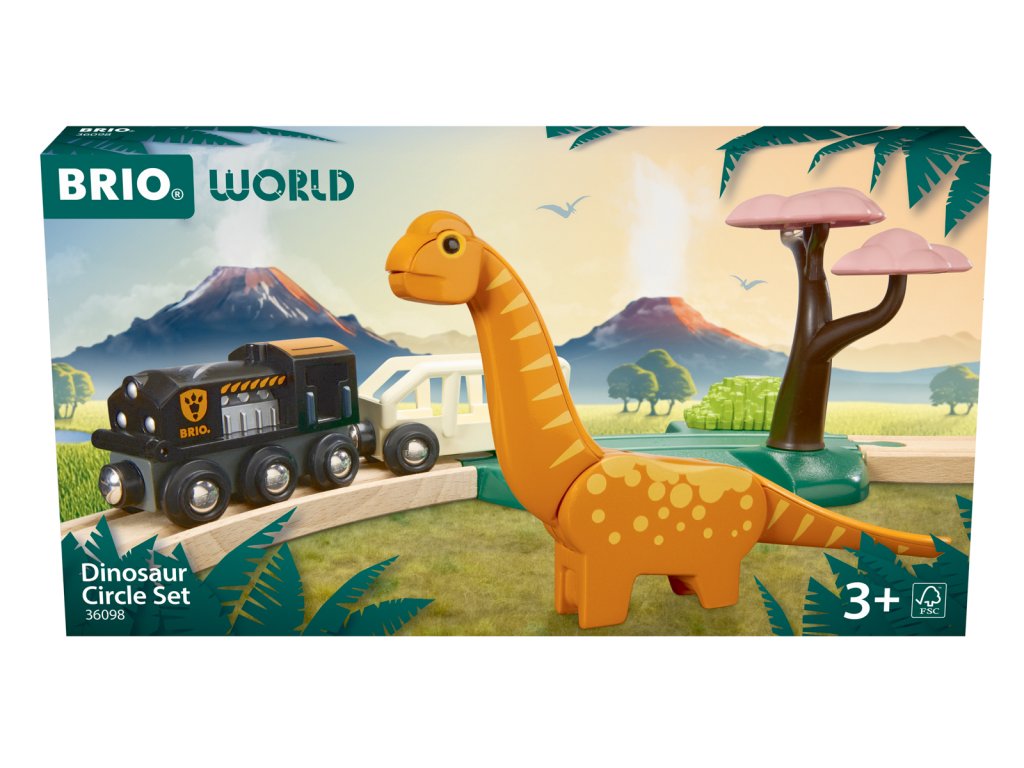 Huaíá! Po dinosauří kruhové vláčkodráze se pohybuje prehistorický tvor! Tato 12dílná dinosauří vláčkodráha obsahuje vláček s vagonkem, figurku dinosaura, přejezd přes travnatou louku a dřevěné kolejnice pro kruhové uspořádání. Na přejezdu buďte opatrní – barevný dinosaurus tuze rád pojídá listí ze stromu. Pohybem ocasu můžete zvedat a spouštět dinosauří hlavu k uchopení příslušenství klasickým magnetem BRIO. Balení: 5x36,5x20cm. Věk: 3+