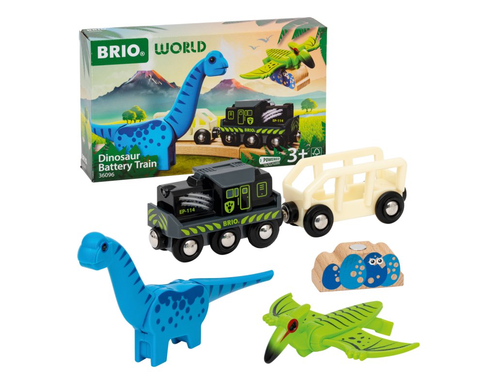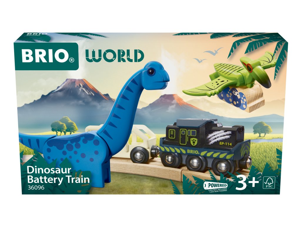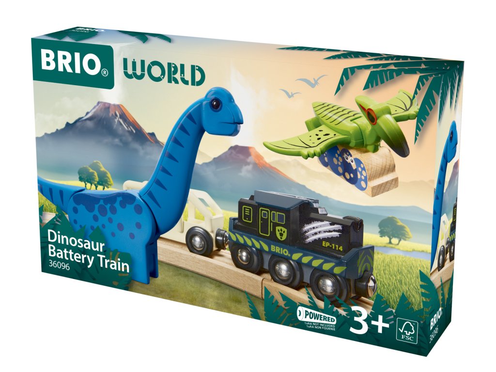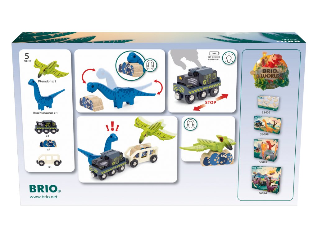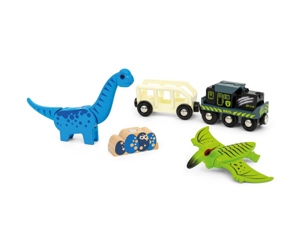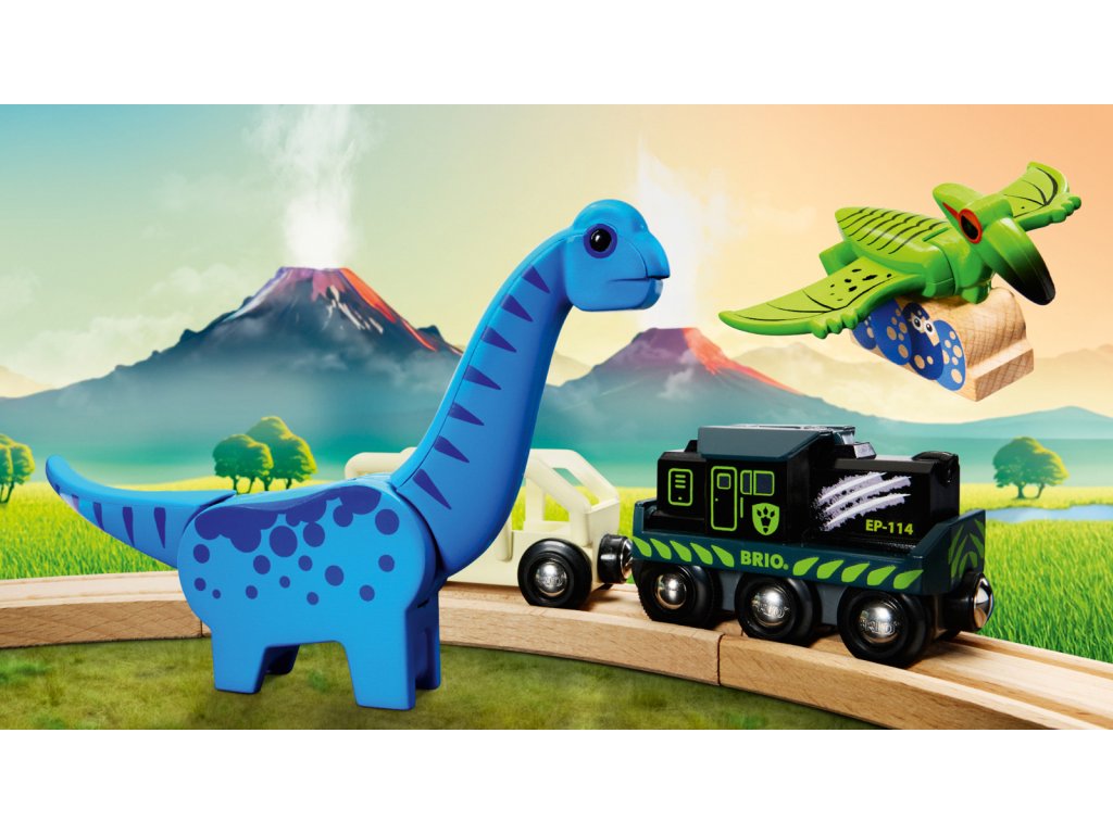 Vydejte se na prehistorické dobrodružství s Dinosauřím vláčkem na baterie. Z paluby vláčku na baterie s funkcí jízdy vpřed, vzad a předním světlem prozkoumávejte svět dinosaurů. Ve vagonku vláčku přepravíte dinosaury a jejich vejce z místa na místo po kolejích. Nechybí dva hraví barevní dinosauři, jedinečné pohyblivé součásti a klasické magnety BRIO pro interakci s okolním světem. Balení: 5x25x15cm. Věk: 3+