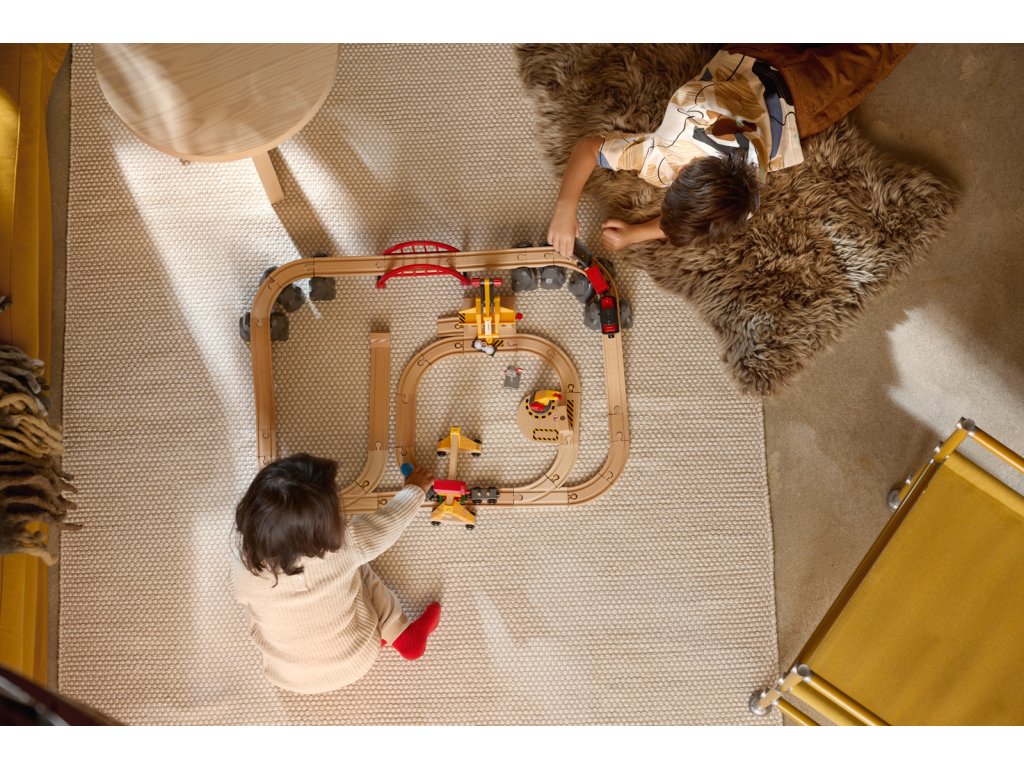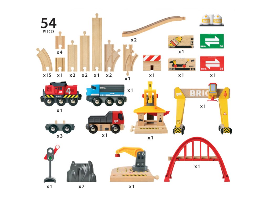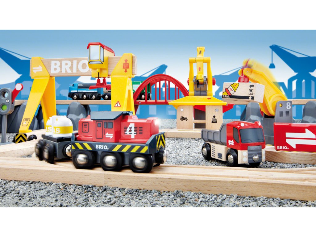 Tato velká sada vláčkodráhy s mostem, obsahuje díly pro sestavení dlouhé dráhy kolejí, kterou můžete sestavit i s vyvýšenými úseky. Součástí sady je silné překladište s jeřábem a mechanický jeřáb,které odvedou svojí práci a naloží a vyloží jakýkoliv náklad. Nákladní vlak na baterie pak náklad odveze do městečka a nákladní auta ho rozvezou kam je třeba. Světělná a zvuková signalizace ukazuje cestu v před! Kompletní sada obsahuje 54 dílů a je v plastovém boxu.