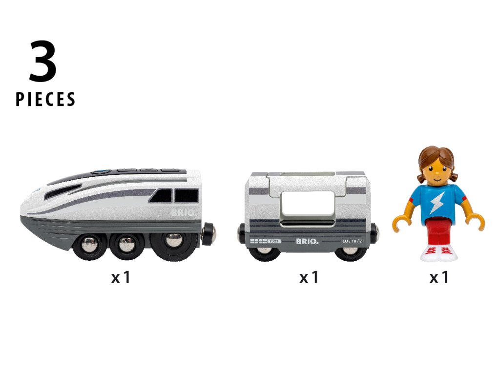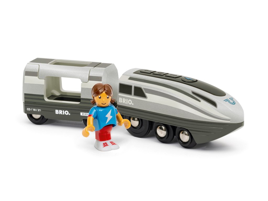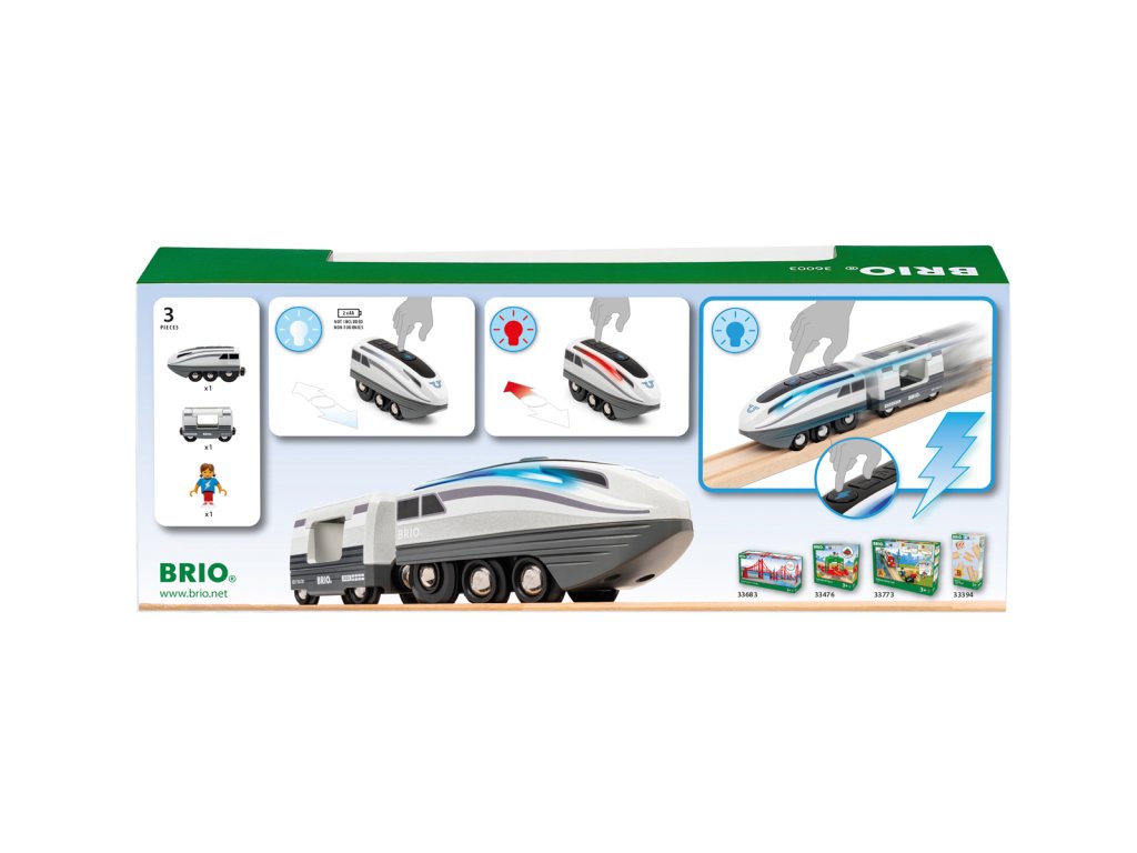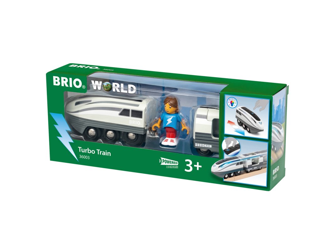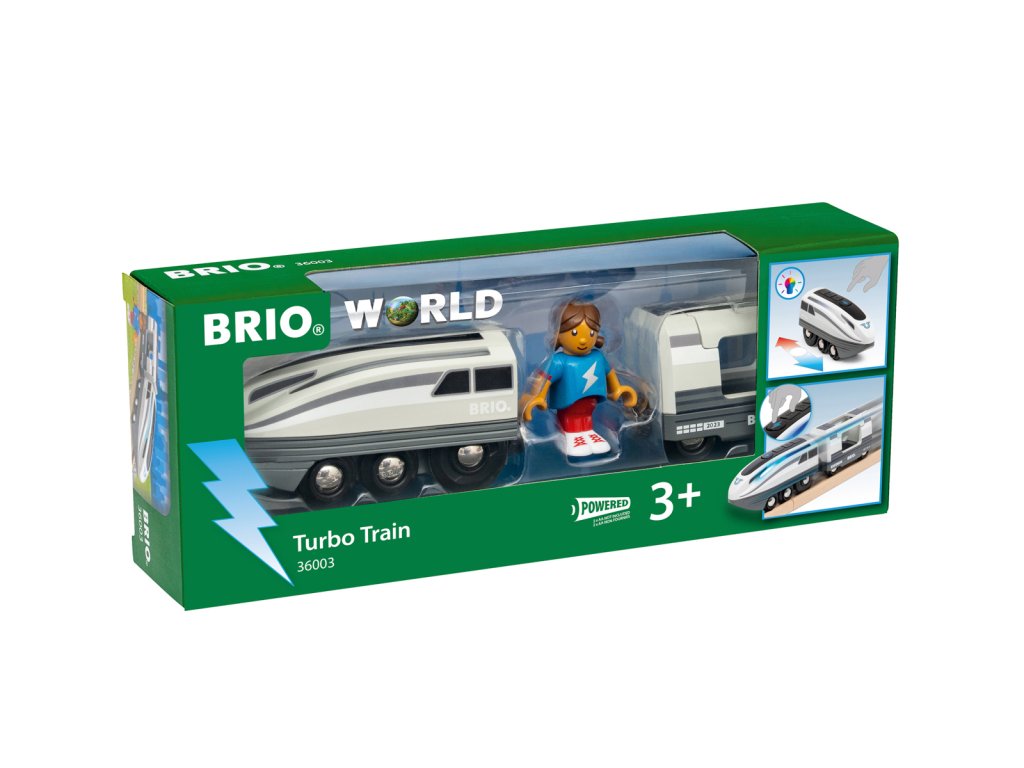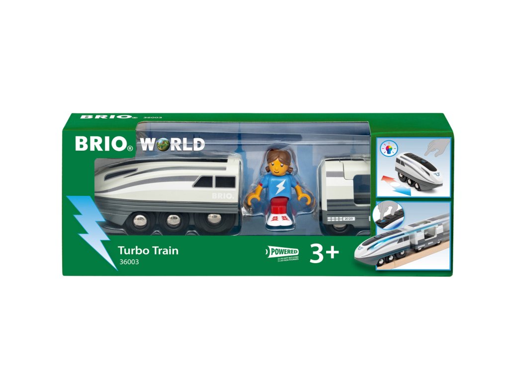 Přináší na koleje ještě větší rychlost: Turbovlak. Stačí stisknout velké tlačítko turbo a tato bateriově poháněná lokomotiva zdvojnásobí svou rychlost. To z ní dělá nejrychlejší lokomotivu na světě BRIO. Turbo boost trvá 5 sekund a jak se lokomotiva rozjíždí, bílé světelné pruhy po stranách se změní na chladnou modrou. Lokomotiva, která má futuristický design, táhne i osobní vůz s místem pro jednoho cestujícího. Balení: 26x22x16cm. Věk: 3+