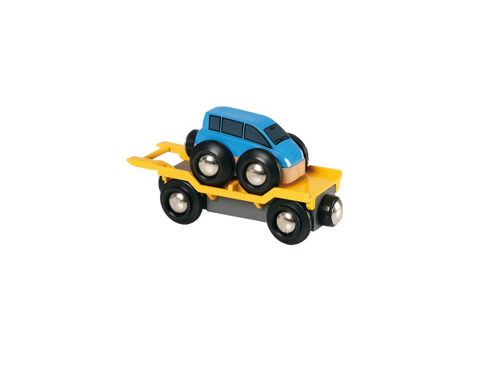 Přívěs na přepravu aut se dá připojit k jakékoliv lokomotivě nebo vozu. Součástí je autíčko s magnetickou spojkou.