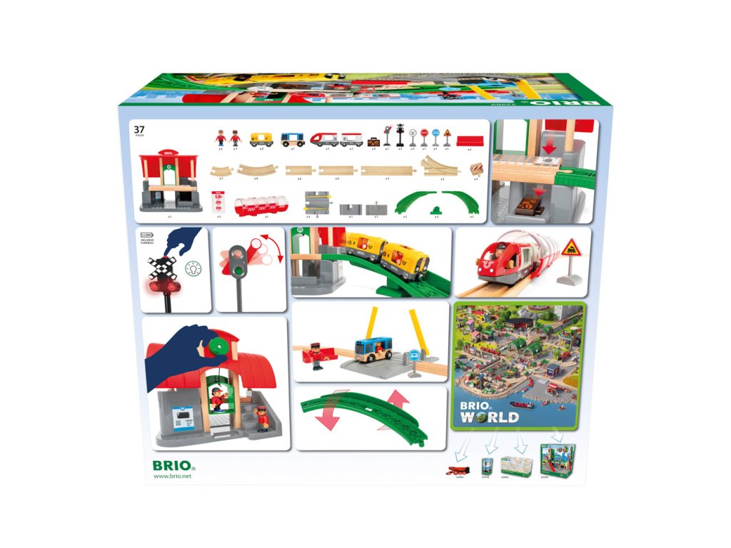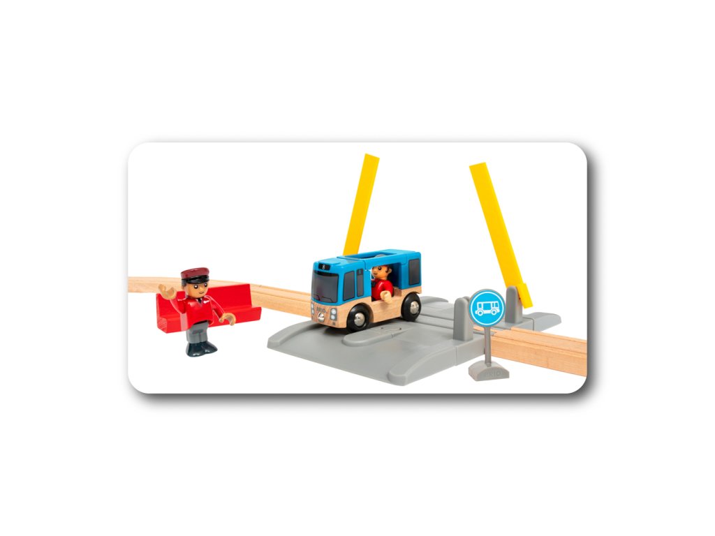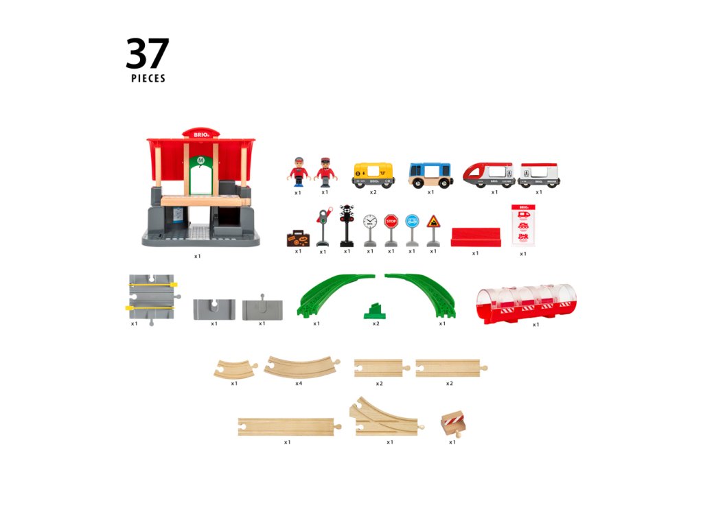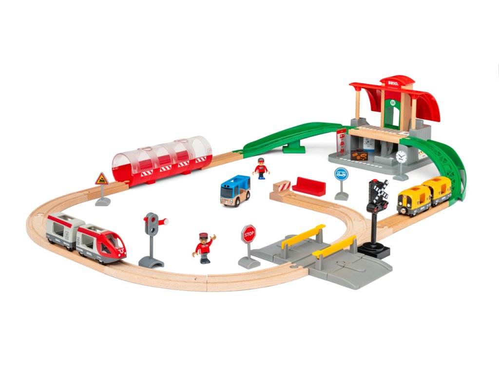 Vezměte si lístek a vydejte se na výlet s touto klasickou 24dílnou soupravou vlakového nádraží s vlaky, stanicemi a příslušenstvím. Začněte svou cestu na velké centrální stanici, kde se cestující mohou vydat nahoru výtahem nebo po schodech a dále mohou přestupovat mezi autobusovými a vlakovými linkami. Vyrobeno z evropského bukového dřeva a vysoce kvalitních plastů s precizními kovovými detaily. Rozměr cca: 144,8 x 20,3 x 69,7 cm. Rozměr balení: 45 x 39 x 21 cm. Baterie: 2x LR44 (jsou součástí balení). Počet dílků: 37. Věk: 3+