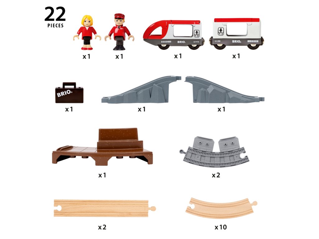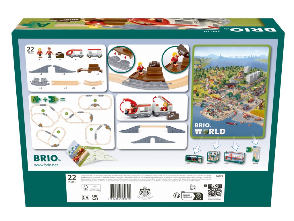 Sada Startovací osobní vlak nabídne vše potřebné k vytvoření první tratě do světa dobrodružství BRIO World. 22dílná souprava obsahuje klasickou trať osmičkového uspořádání, v jejímž středu stojí křižovatka tunelu a mostu s nádražním nástupištěm pro hraní s postavičkami. Postavte figurku strojvedoucího do přední části osobního vláčku, vyzvedněte cestující se zavazadly čekající na nástupišti a vydejte se na cestu po ikonických dřevěných kolejích BRIO. Balení: 9x37,3x27,3cm. Věk: 3+