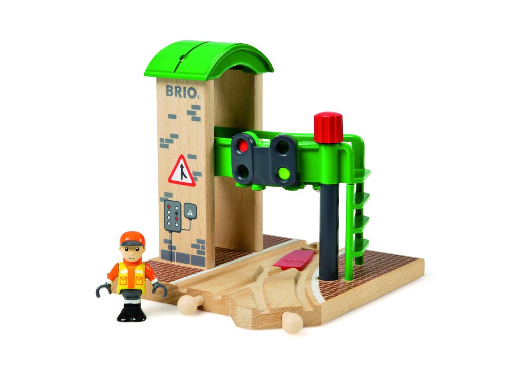 Signální stanice s výhybkou. Otáčením červeného knoflíku, rozhodnete jakým směrem se vlak vydá či zastaví nebo bude pokračovat dál v jízdě.