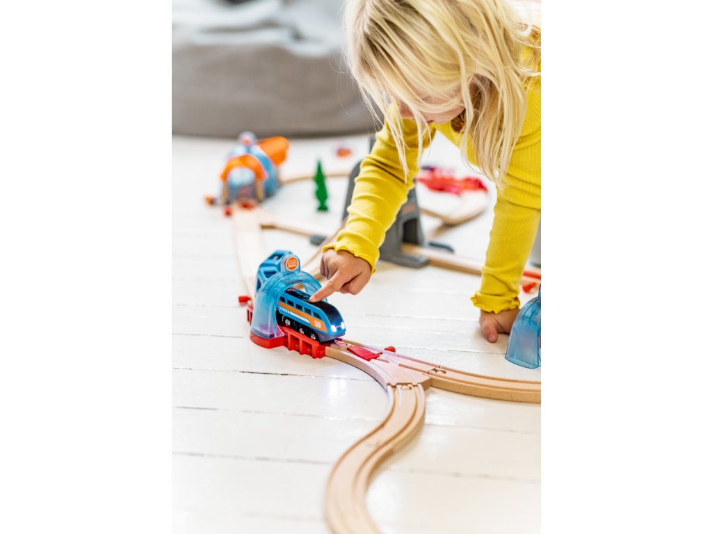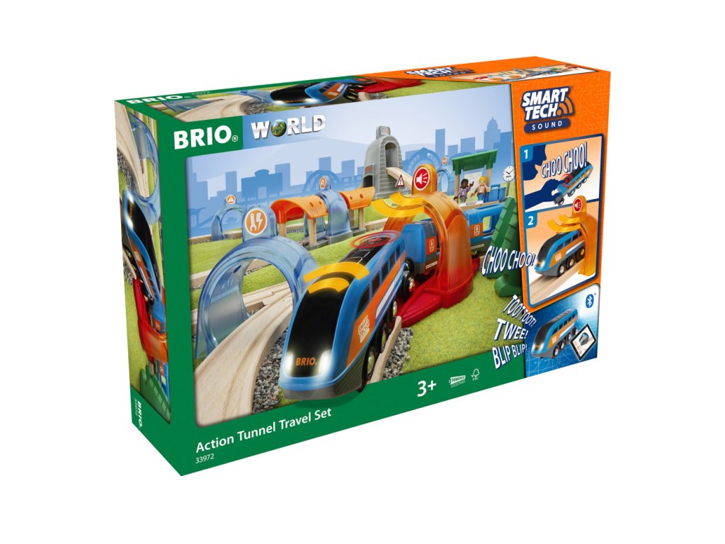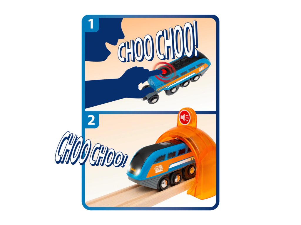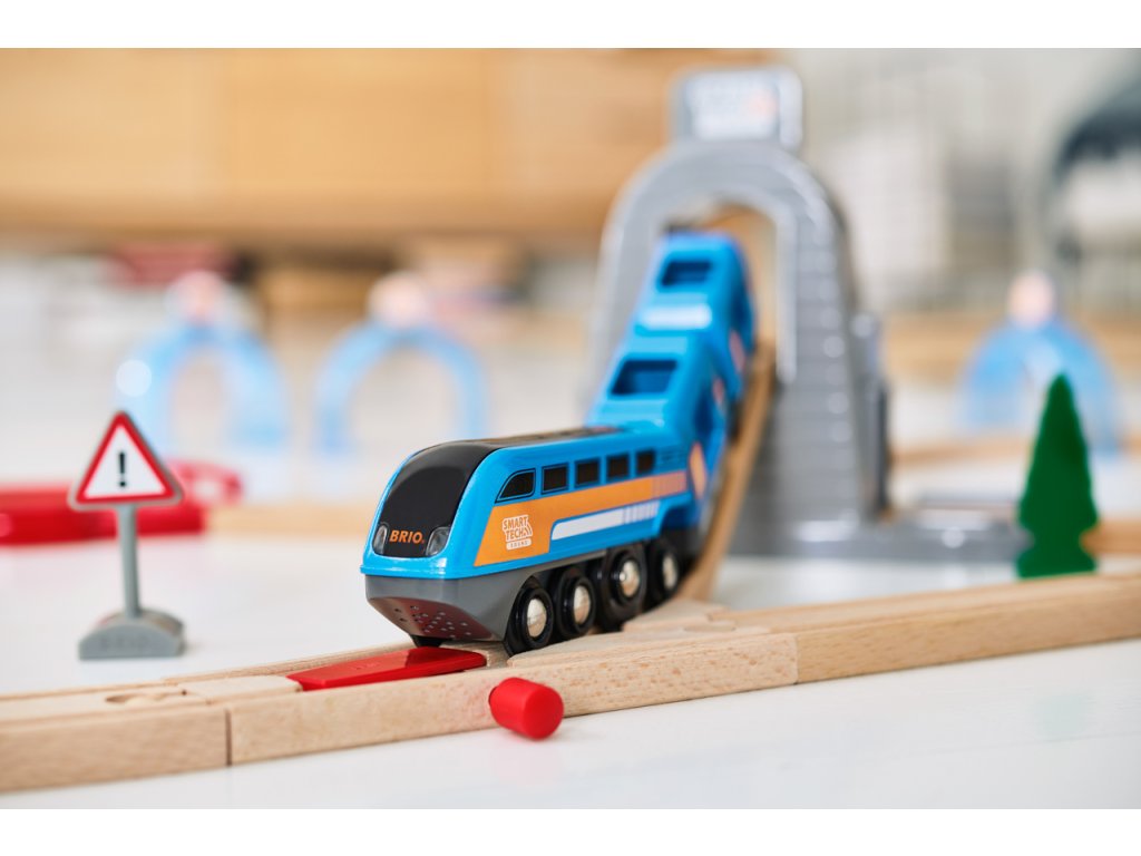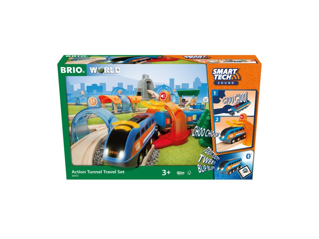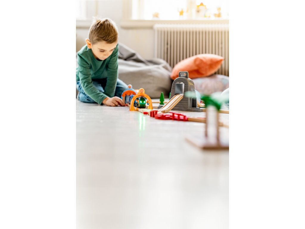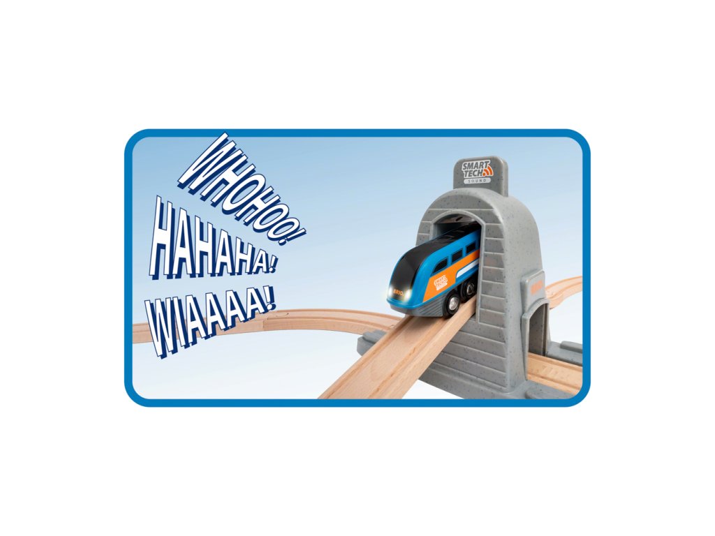 Deluxe vláčkodráha s tunely SMART TECH SOUND. Užijte si hru s touto 37 dílnou interaktivní sadou vláčků SMART TECH SOUND a SOUND ACTION tunely. Technologie SMART TECH SOUND umožňuje vlakům komunikovat se svým okolím a automaticky reagovat. Vícebarevná světla, pohyb a zvuky dělají hru zábavnější. Každý SOUND ACTION tunel tvoří jedinečnou odezvu. Ovládejte směr vlaku pomocí tunelu nebo jej zastavte. Sledujte, jak vlak zpomaluje a mění barvu světel poté, co vjede do servisního SOUND ACTION tunelu. Předem nahrané zvuky uslyšíte, jakmile vlak projede pod SOUND ACTION tunelem. Naprogramujte si svou trať dle svých představ a dobrodružství s BRIO World může začít. Sada obsahuje 37 dílků. Baterie: 2x AAA (baterie jsou součástí balení). Rozměr balení: 60 x 39 x 15 cm. Věk: 3+. Video: https://vimeo.com/453285808
