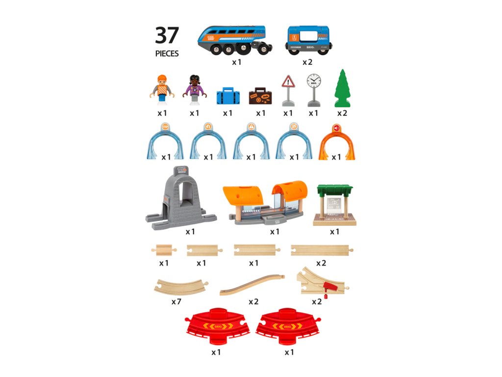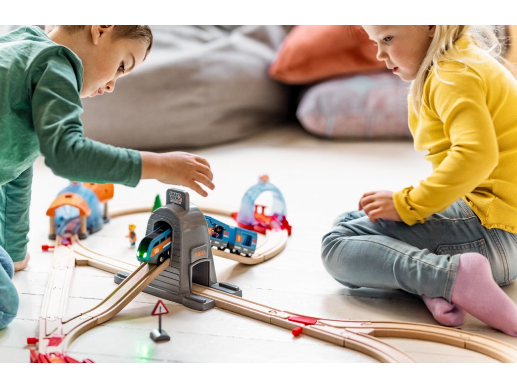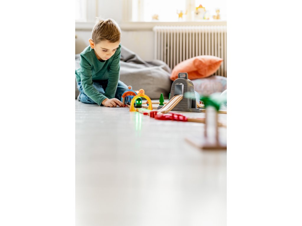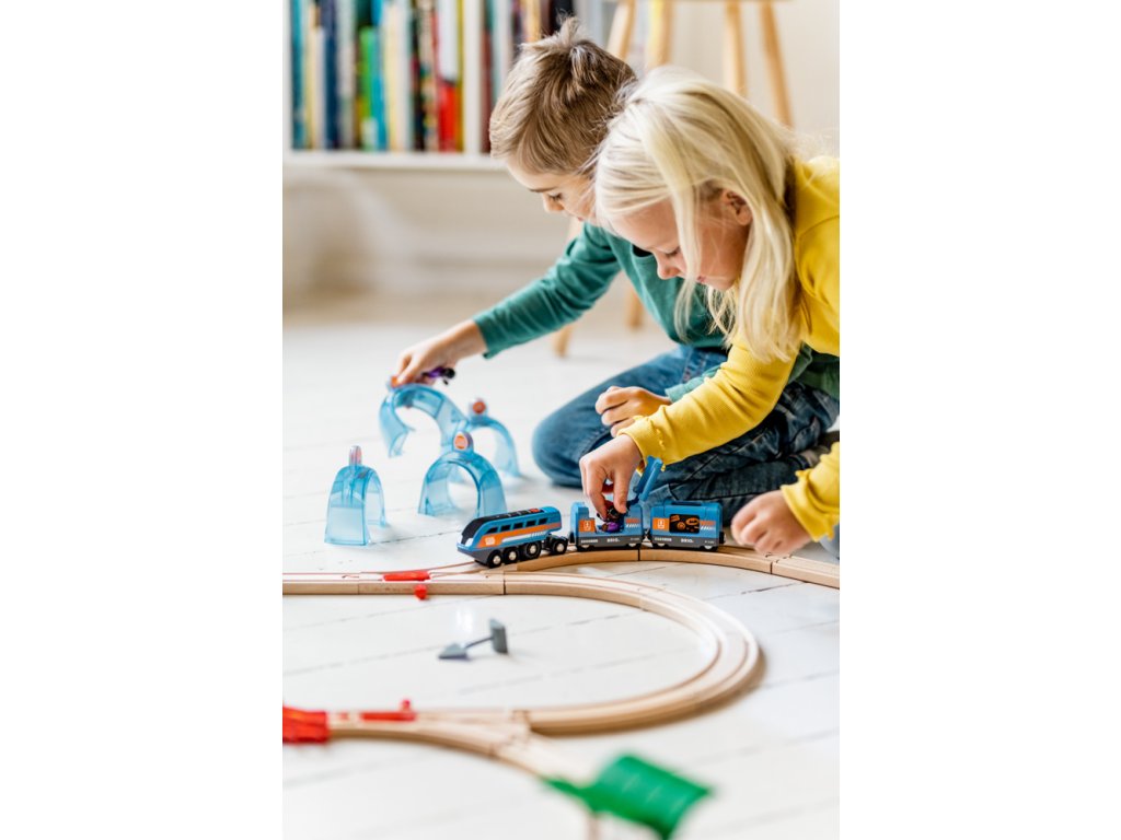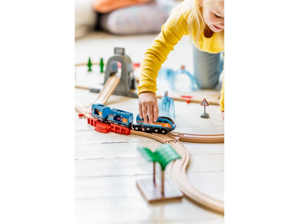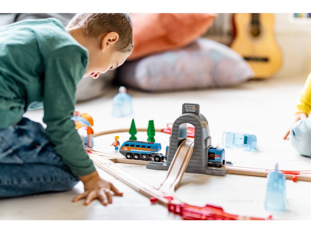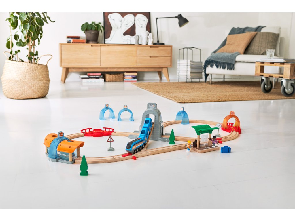 Deluxe vláčkodráha s tunely SMART TECH SOUND. Užijte si hru s touto 37 dílnou interaktivní sadou vláčků SMART TECH SOUND a SOUND ACTION tunely. Technologie SMART TECH SOUND umožňuje vlakům komunikovat se svým okolím a automaticky reagovat. Vícebarevná světla, pohyb a zvuky dělají hru zábavnější. Každý SOUND ACTION tunel tvoří jedinečnou odezvu. Ovládejte směr vlaku pomocí tunelu nebo jej zastavte. Sledujte, jak vlak zpomaluje a mění barvu světel poté, co vjede do servisního SOUND ACTION tunelu. Předem nahrané zvuky uslyšíte, jakmile vlak projede pod SOUND ACTION tunelem. Naprogramujte si svou trať dle svých představ a dobrodružství s BRIO World může začít. Sada obsahuje 37 dílků. Baterie: 2x AAA (baterie jsou součástí balení). Rozměr balení: 60 x 39 x 15 cm. Věk: 3+. Video: https://vimeo.com/453285808