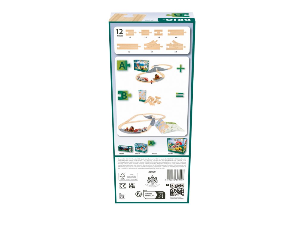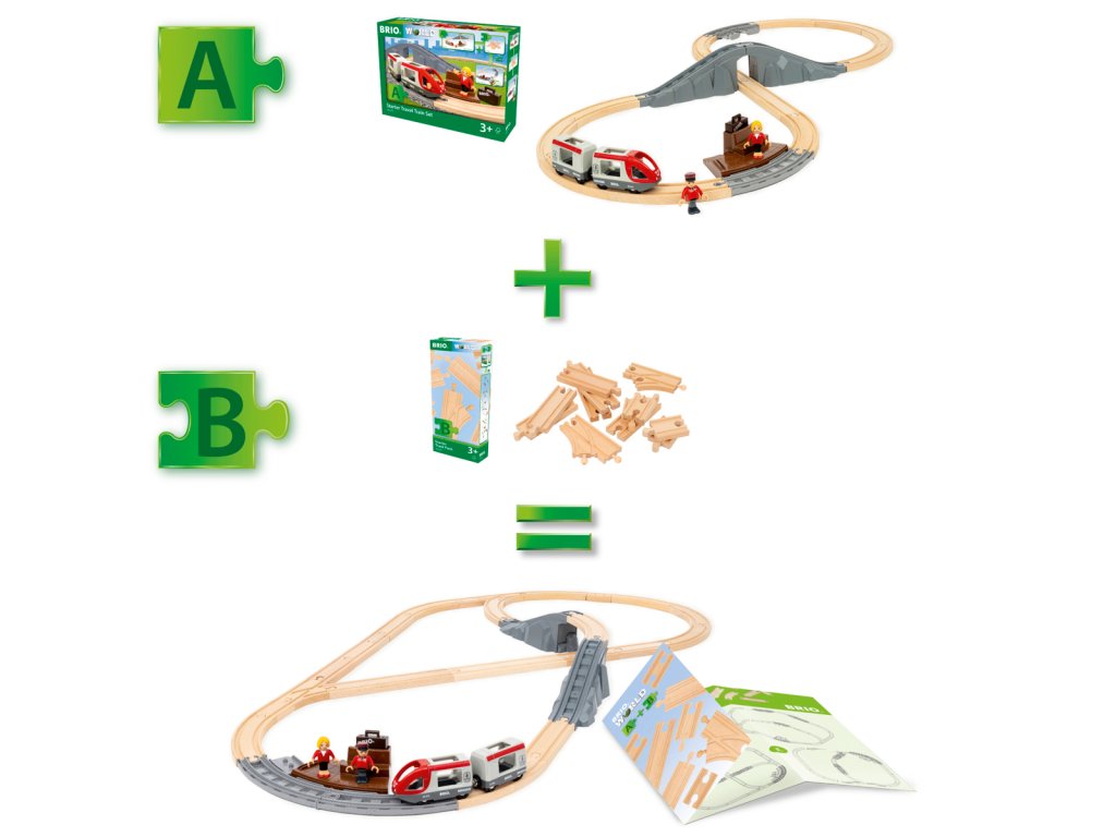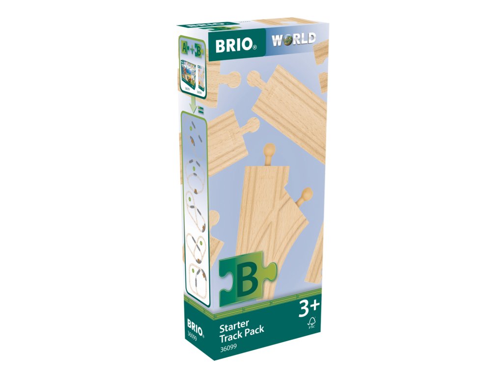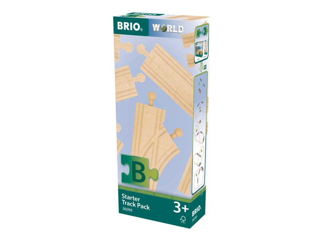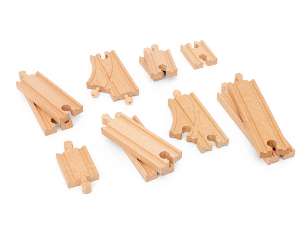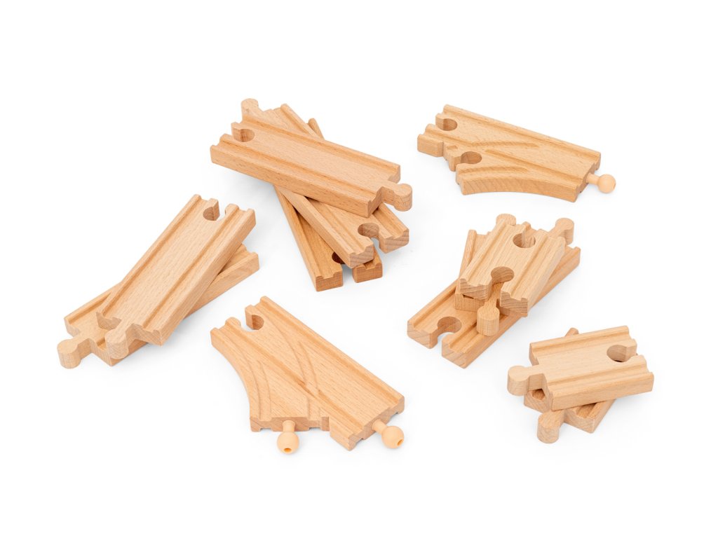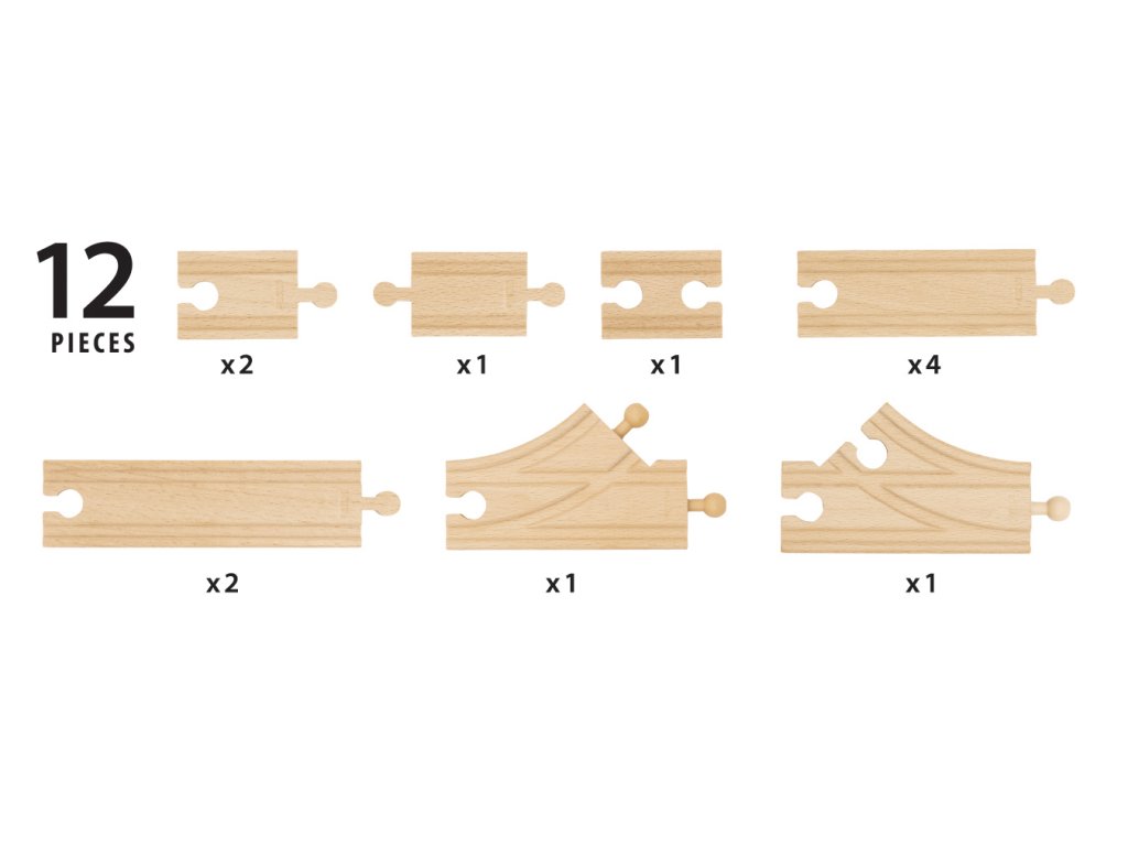 Startovací sadou kolejnic. Sada obsahuje výběr dřevěných dílů, které lze použít k vytvoření dalších pěti typů uspořádání tratí se 36079 Startovacím osobním vlakem (prodává se samostatně). Kombinujte různé délky přímých kolejnic, výhybek a spojovacích kolejnic. Balení: 5,4x11,5x27,3cm. Věk: 3+