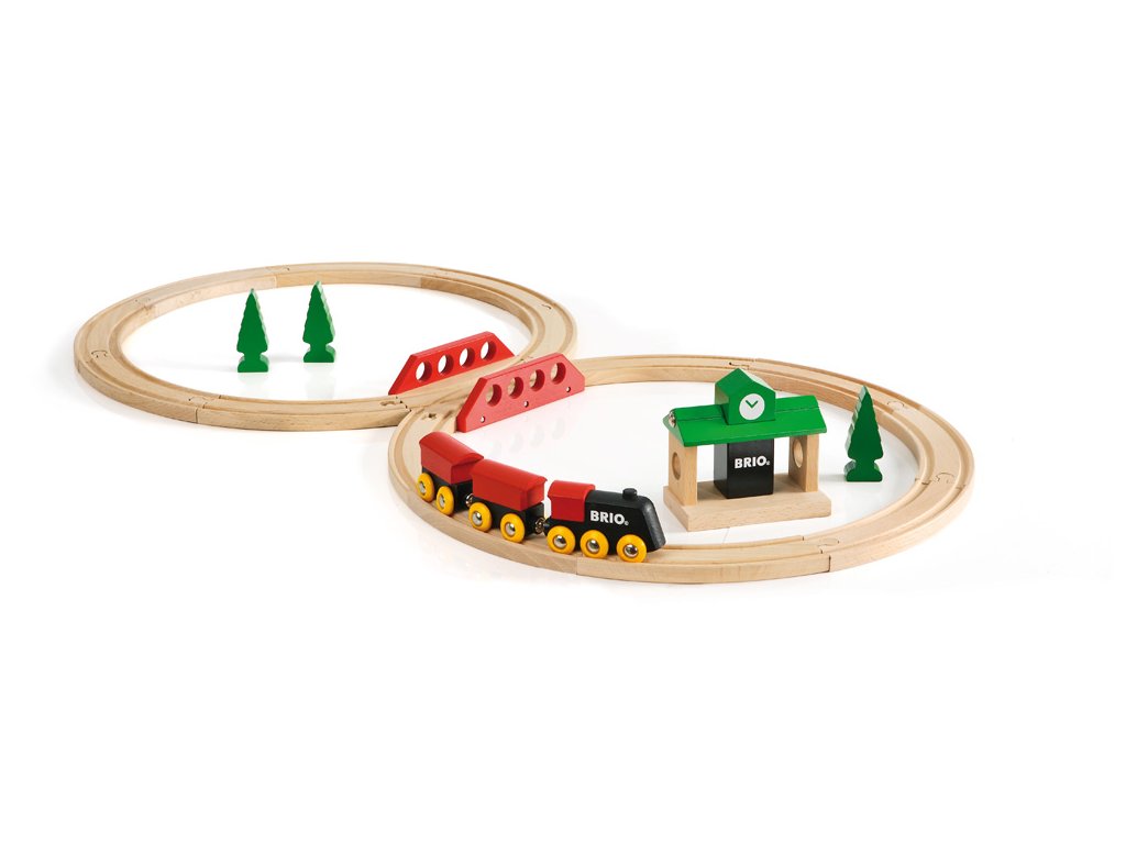 Vláčkodráha ve tvaru osmičky obsahuje lokomotivu s vagonky,stanici a stromečky. Díly jsou vyrobené z kvalitního dřeva a mají plastové doplňky. Tato souprava je kompatibilní s ostatními dřevěnými vláčkodráhami Brio.