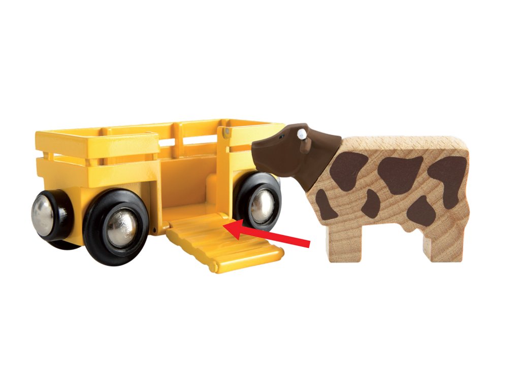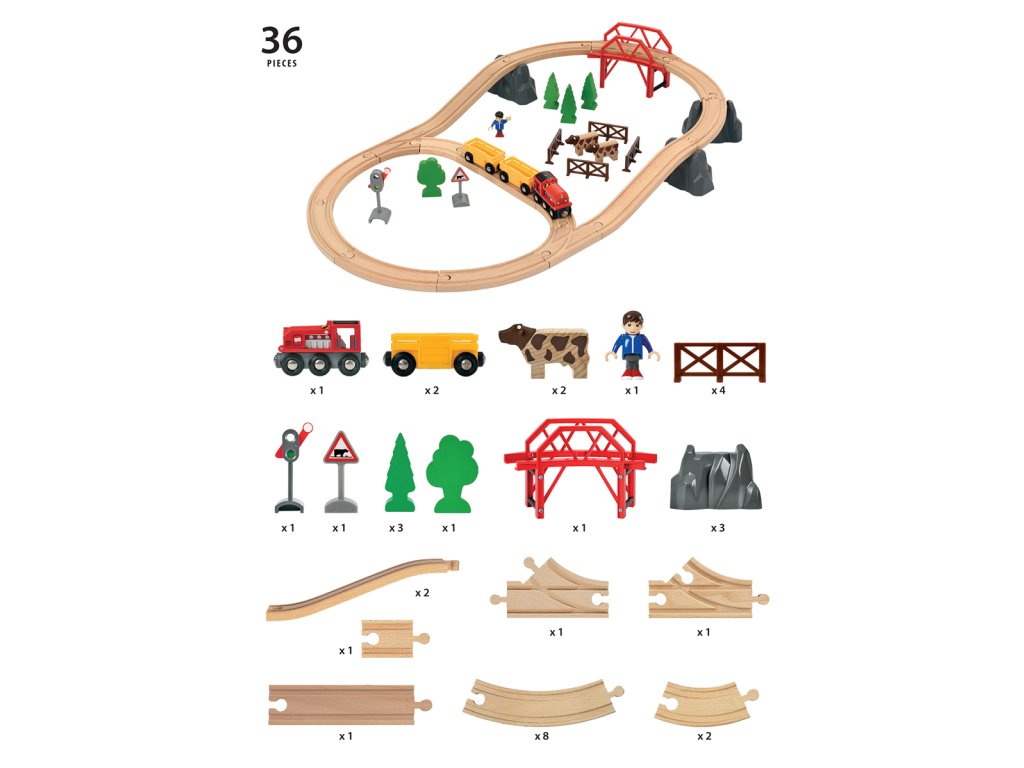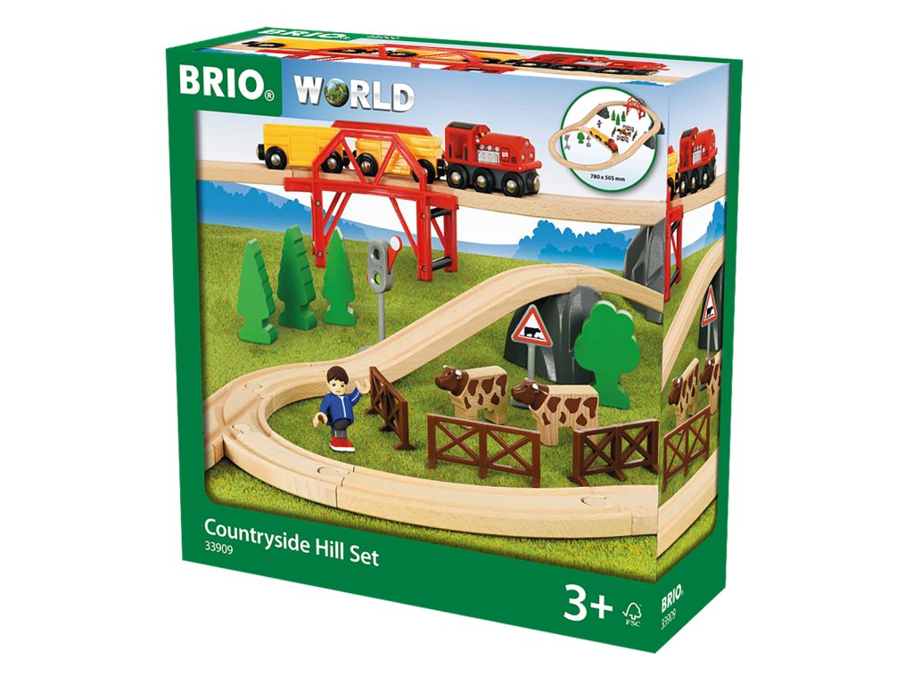 Dřevěná sada Countryside hill vláčkodráha s venkovskou krajinou. Se sadou Countryside Hill mohou malí strojvedoucí zažívat svá vlastní dobrodružství a příběhy. Kromě úžasných železničních prvků a vagónků je součástí sady také parádní most, krajinné prvky, jako jsou stromy a skály, a také figurka a dvě krávy. Krávy se mohou vozit ve vagónech pro dobytek a nechat se tak odvézt na pastvu. Dřevěné koleje – bukové dřevo s certifikací FSC. Atraktivní trasa – most a koleje vedoucí do kopce a z kopce. Funkční prvky – vagóny se sklápěcí rampou pro zvířátka, funkční signalizátor na páku. Rovné, zaoblené tvary, bezpečná, netoxická barva. Sada obsahuje 36 dílků. Obsah balení: 16 x dílek dráhy, 1 x můstek (cca. 19 x 11 cm), 2 x skála/ podpěra pod dráhu, 1 x lokomotiva (cca. 8 cm), 2 x vagón (cca. 8 cm), 1 x figurka muže (cca 5 cm), 2 x kravička, 10 x doplněk – stromy, dopravní značka, signalizace, plot. Rozměry dráhy cca.: 50,5 x 78 cm. Rozměry balení: 34,5 x 34,5 x 12 cm. Věk: 3+