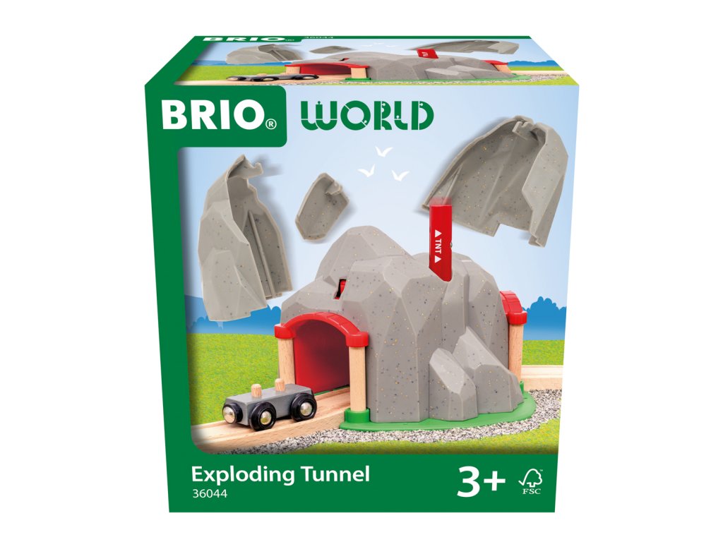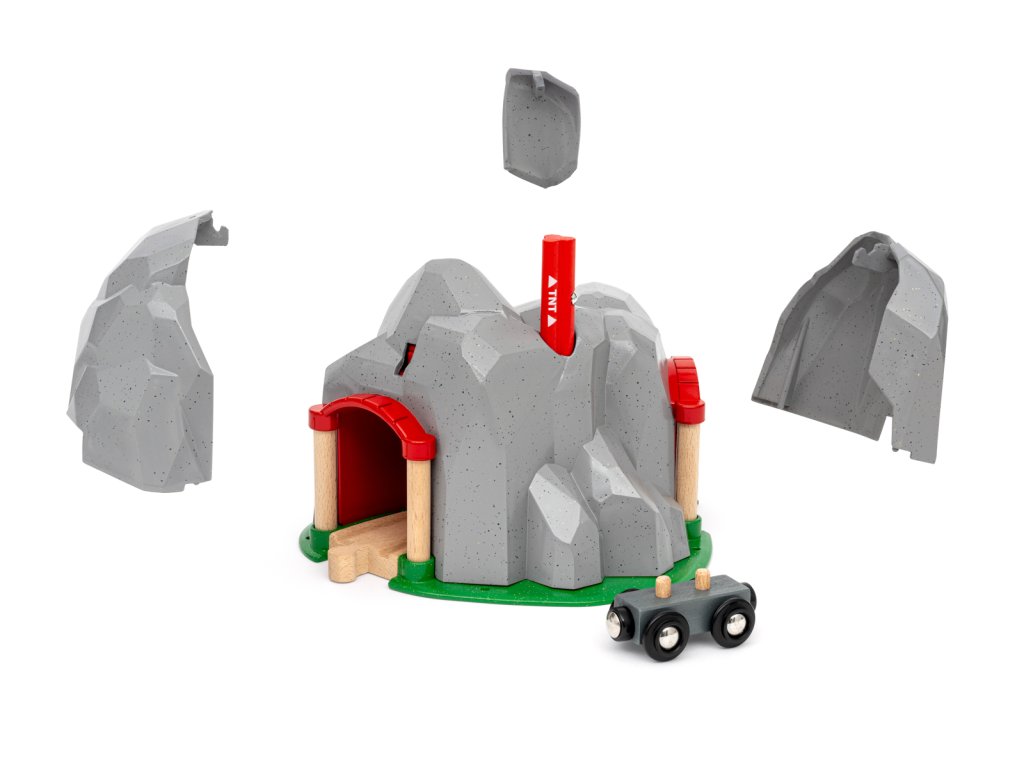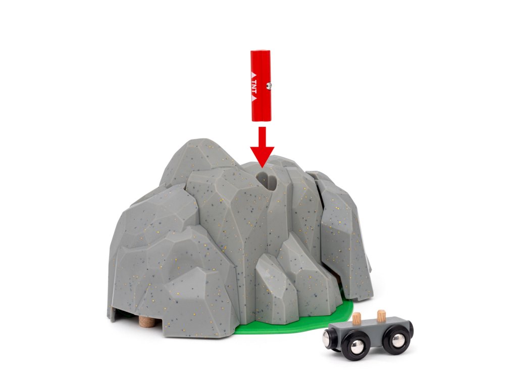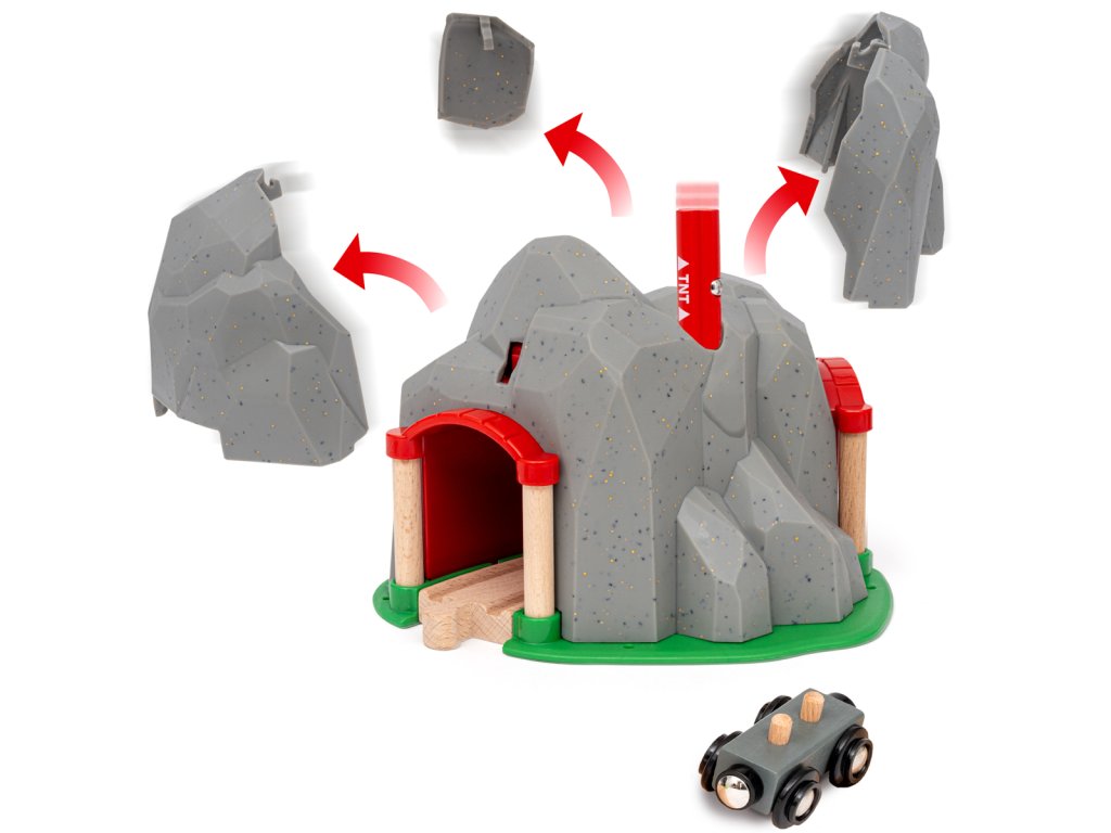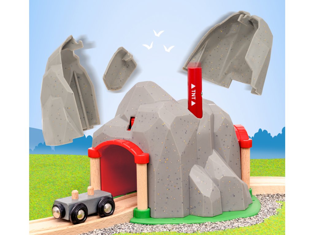 BUM! Vyhoďte horu do povětří a projeďte jejím středem – vybuchujícím tunelem. Velká sada s realistickým kamenným povrchem a skrytým železničním tunelem bude skvělým doplňkem každé sady BRIO World. Do vrtu vložte TNT nálož a sledujte, jak hora exploduje a odhalí tajný tunel. Hračka je vyrobena z robustních plastových a dřevěných dílů a díky průchozí zakřivené dřevěné dráze ji snadno propojíte s ostatními hračkami BRIO World. Vybuchující tunel obsahuje 3 díly: 1× vybuchující tunel s oddělitelnými částmi, 1× TNT nálož a 1× vagon. Rozměry balení: 20 x 18 x 16 cm. Věk: 3+