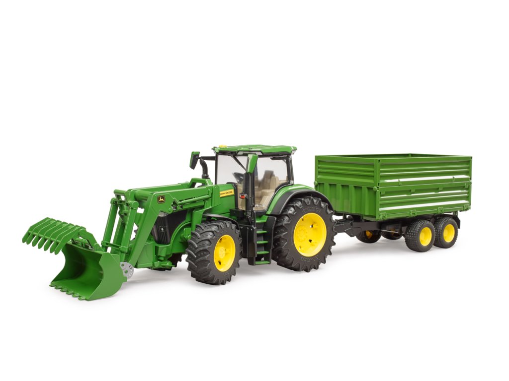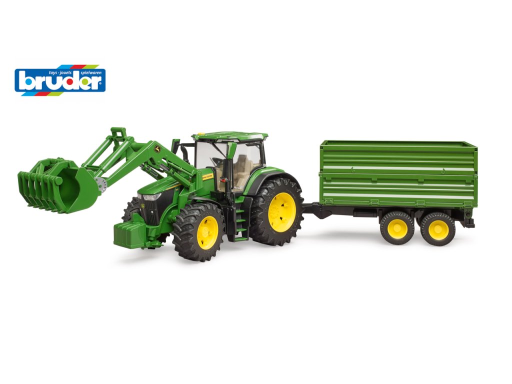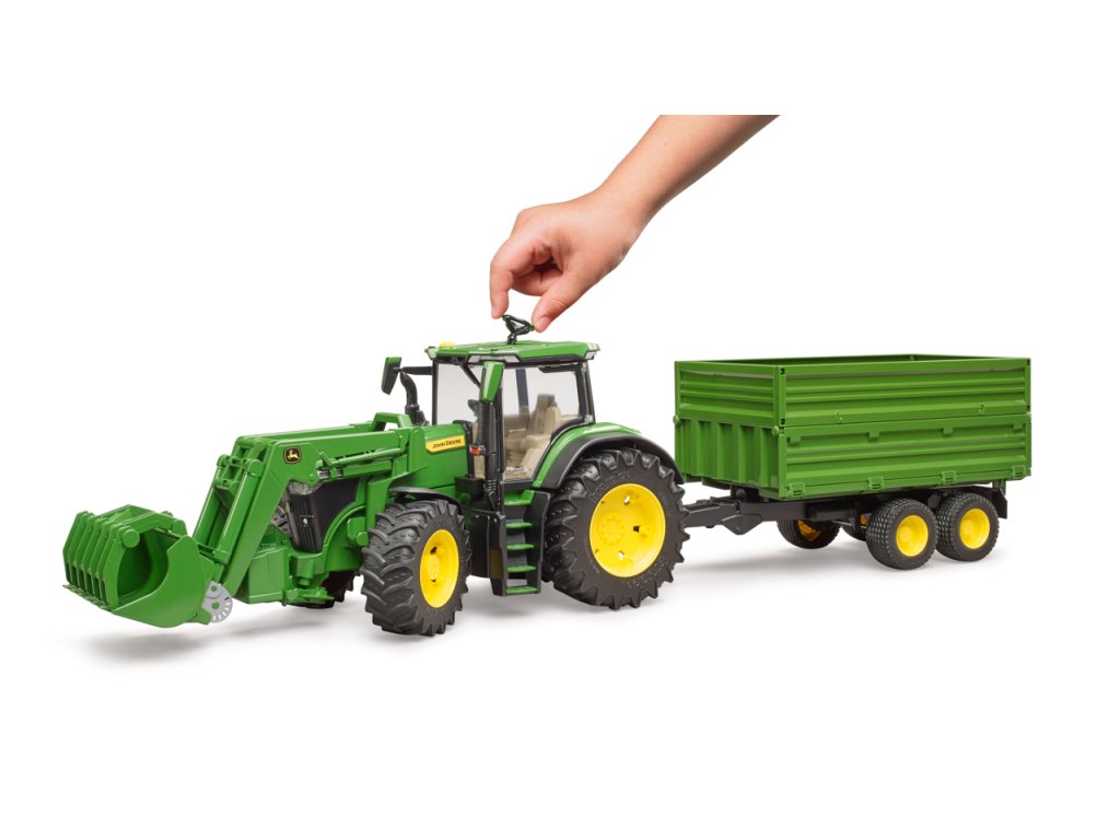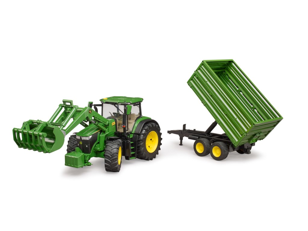 Traktory John Deere řady 7R: kombinují nízkou celkovou hmotnost s vysokým výkonem. Tento obratný traktor nejen zrychluje přepravu, ale také posouvá vpřed každé podnikání. Traktor je vybaven mnoha realistickými detaily. Kapota se otevře a odhalí impozantní motor. Dveře lze otevřít a přepravovat postavy bworld v moderní kabině. Pro BRUDER je typická vynikající ovladatelnost a jízdní komfort díky vestavěné kyvadlové nápravě a prodloužení řízení, které lze použít přes střešní okno. Přívěs má sklápěcí funkci. Horní boční stěny lze sejmout a spodní boční stěny otevřít na 3 strany. Díky výškově nastavitelnému zadnímu závěsu traktoru lze pomocí stávajícího čelního nakladače používat a současně nakládat i všechny ostatní přívěsy ze světa zemědělské tématiky. Měřítko: 1:16 Rozměr balení: 19 x 22 x 75 Věk: 3+