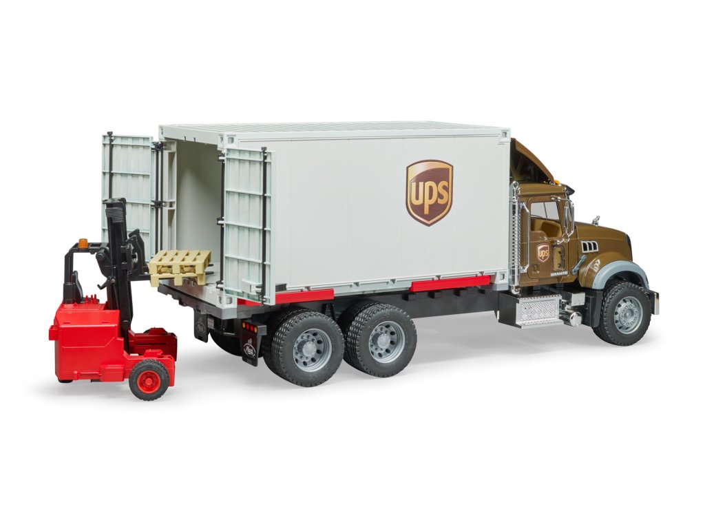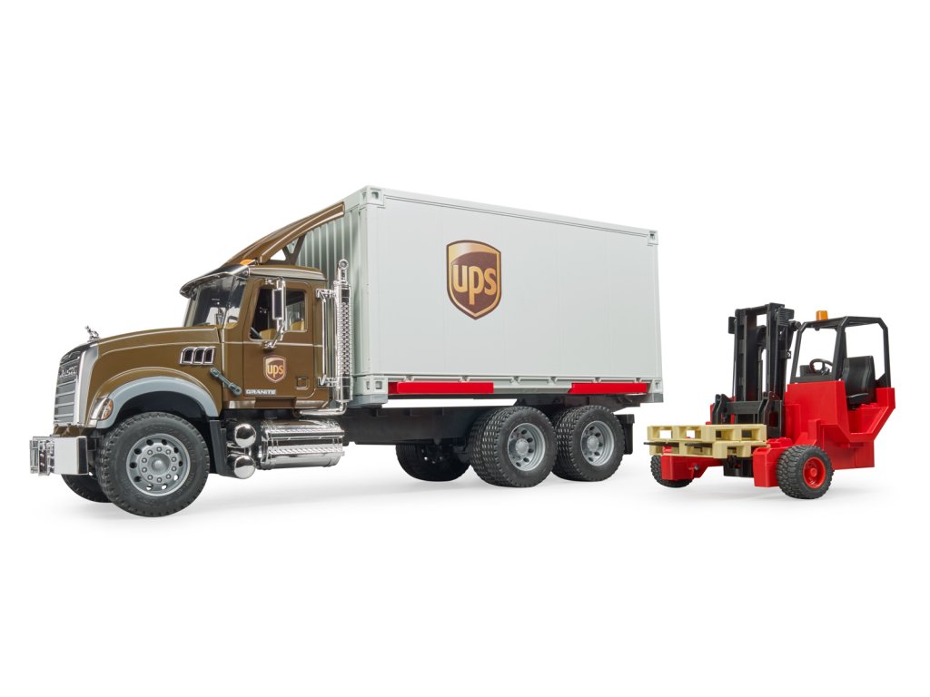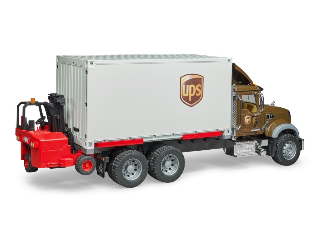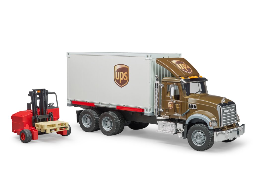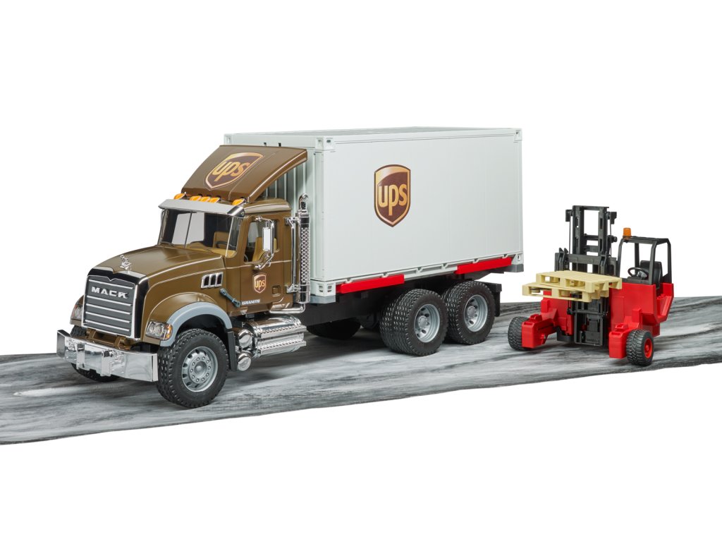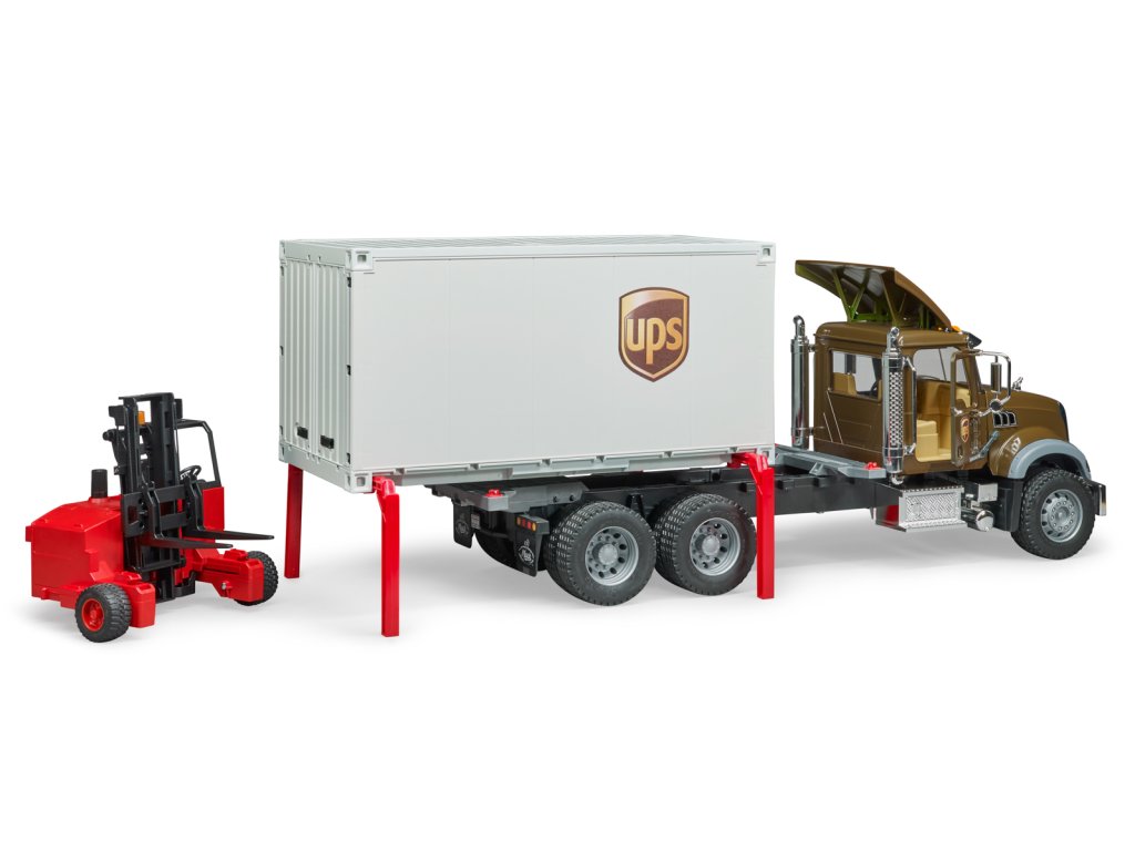 Nákladní vůz MACK Granite s výměnnou nástavbou na kontejnery je nejen skutečným poutačem pro fanoušky nákladních vozidel, v originálním designu od globálního poskytovatele přepravních služeb UPS. S realistickou kabinou, otevíracími dveřmi, sklopnými zpětnými zrcátky, mnoha nástavci s chromovým efektem a výklopnou kapotou je funkčním univerzálem. Stejně jako u velkého prototypu lze nakládání provádět také na modelu prostřednictvím křídlových dveří vzadu. Další vynikající herní možností tohoto vozidla je výměnná nástavba, která se automaticky odpojí od vozidla vytažením a nastavením svých podpěrných nohou a zvedne kontejner, což umožňuje vozíku vyjet zpod výměnné nástavby. Pro flexibilní nakládání a vykládání, a to i na malých plochách, přívěs nese vysokozdvižný vozík namontovaný na návěsu.