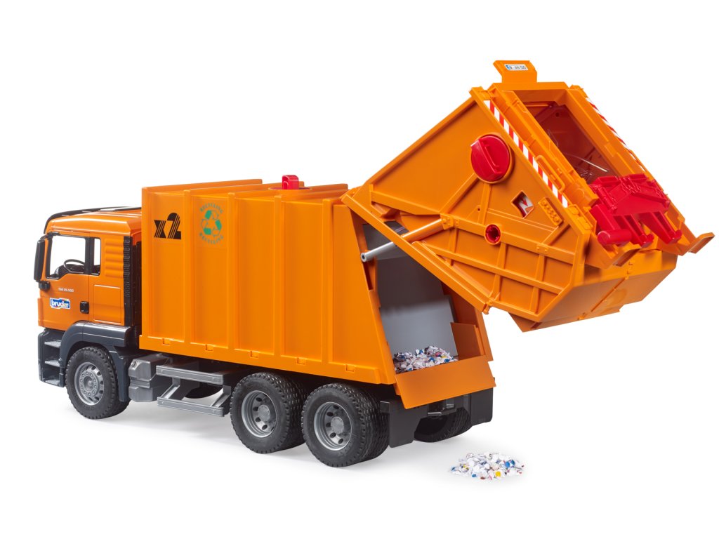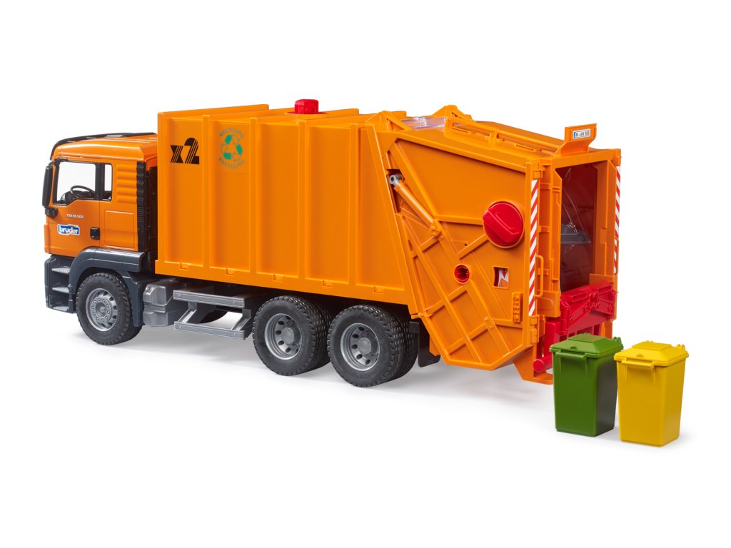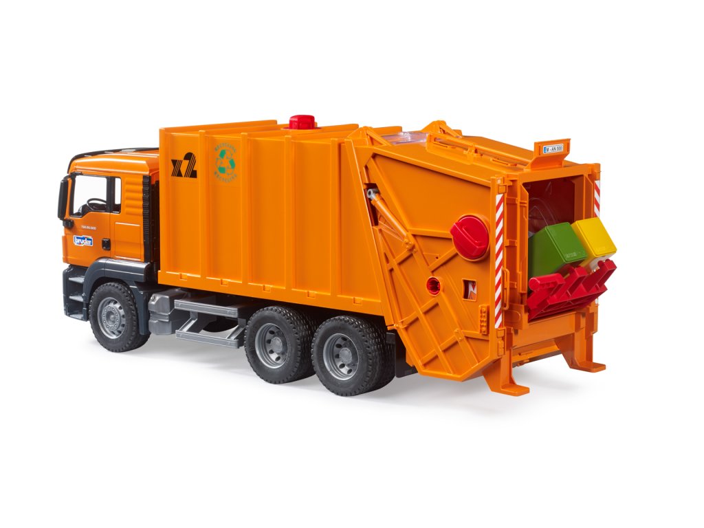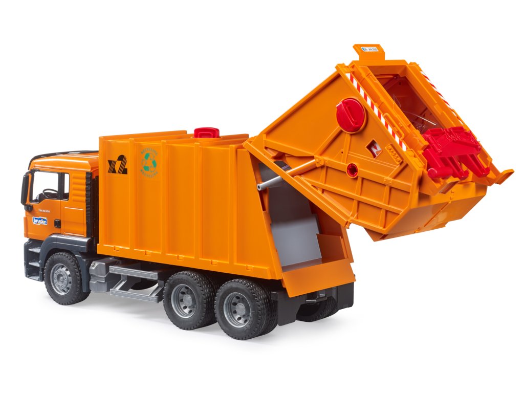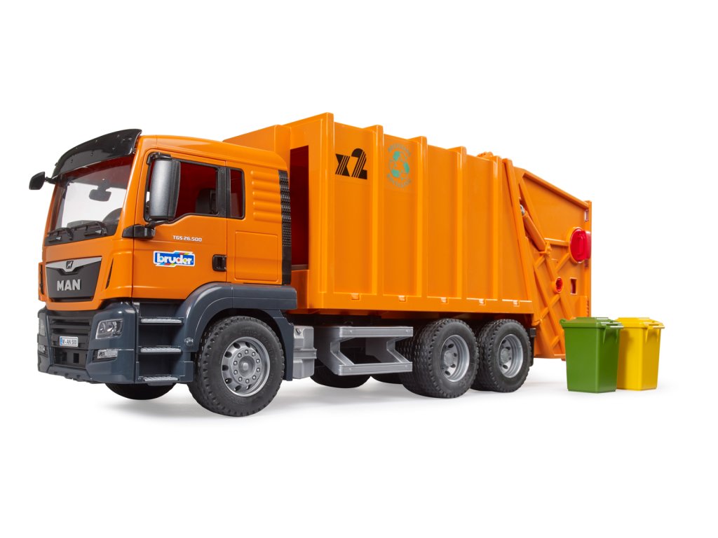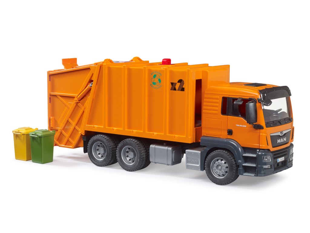 MAN TGS je perfektní všestranný vůz pro staveniště, dálkovou dopravu a místní distribuci. Robustně postavený, vybavený motory s vysokým točivým momentem a nadprůměrným užitečným zatížením je tento nákladní vůz prototypem tolik popisovaného „všestranného vozu“. Dvoubarevná kabina řidiče má dveře, které lze otevřít a nabízí každé postavě bworld moderní pracoviště. Celý proces nakládání a vykládání popelářského vozu je řízen unikátním otočným kolečkovým mechanismem, který umožňuje vysypání dvou popelnic současně. Stejný postup je možný také s odpadní nádobou díky flexibilnímu nosnému držáku. Postup: odpadkové koše se zasunou do nosné konzoly, odpadky se pak vysypou do žlabu zvednutím. Toto je za otáčení kola vtaženo do funkčního lisovacího mechanismu, zhutněno a následně transportováno do odpadového prostoru. Tento proces je vizualizován pomocí průhledového okna. K vysypání odpadu slouží rukojeť připevněná k horní části odpadního prostoru. Otočením této rukojeti je odpad transportován ven pomocí vynášecího vozíku kolem nakládací a vykládací jednotky, která byla vytlačena nahoru. Dva malé přiložené popelnice a běhouny dotvářejí herní pole. Rozměry: 20,5x29x71cm. Věk: 3+