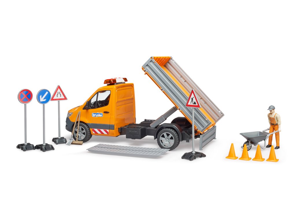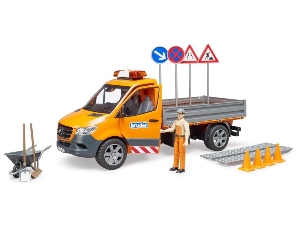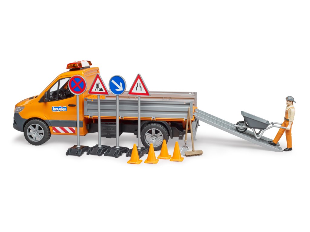 Průkopnický, efektivní, spolehlivý – tak Mercedes Benz popisuje nový Sprinter. I v nejnovější generaci zůstává všestranným a všeobecně oblíbeným dopravním profesionálem. Opravné a údržbářské práce na silnicích, chodnících a parcích jsou k vidění v každém městě a obci. MB Sprinter je díky své velikosti a variabilitě vozem pro tento typ práce. Vozidlo má sklopnou nakládací plošinu a boční stěny lze otevřít. Součástí dodávky jsou nájezdové rampy pro přepravu malých vozidel. Aby zábava mohla začít hned, je součástí dodávky stavební dělník spolu s kolečkem, nářadím, značkami a pylony. Sprinter je vybaven světelným a zvukovým modulem. Kromě tří různých zvuků sirény můžete pustit i zvuk motoru vozidla. Příštímu staveništi v dětském pokoji tedy nic nestojí v cestě. Měřítko: 1:16 Rozměr balení: 20,5 x 19,5 x 50,5 Věk: 4+