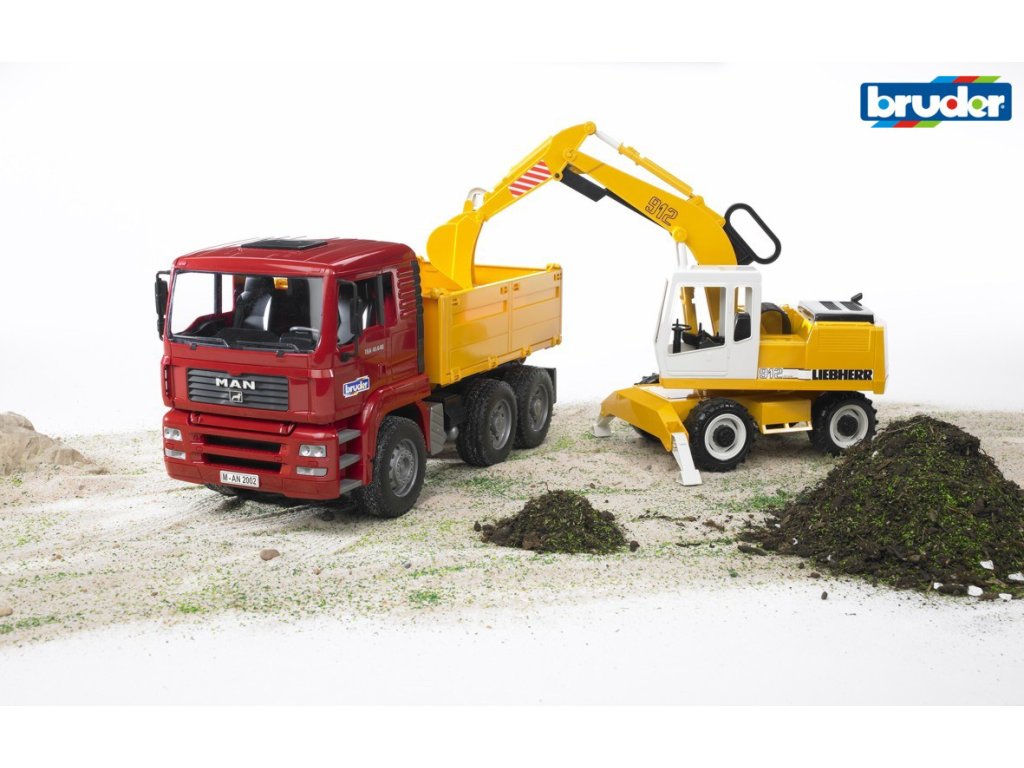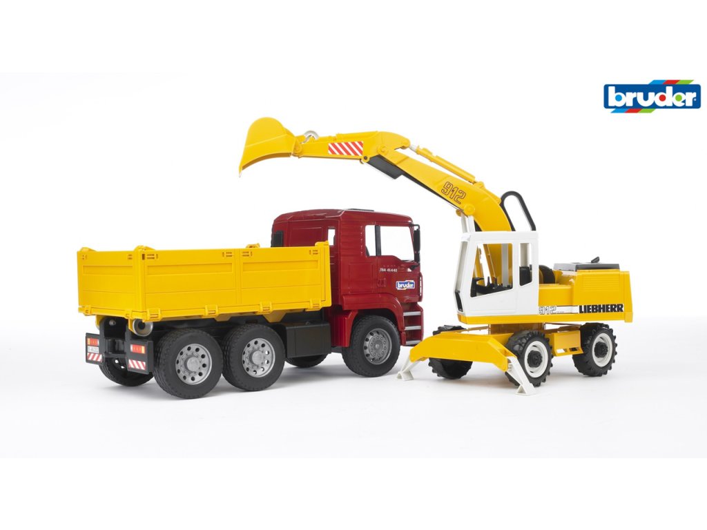 Konstrukční vozy - MAN TGA nákladní auto s Liebherr bagrem . Detailně propracovaný model klasického sklápěče MAN a bagru LIEBHERR na nakládání materiálu. Nakladač je vybaven měkkými pneumatikami, má skládací zrcátka, průhlednou kabinu a sklopnou korbu. Bagr disponuje pohyblivým ramenem se lžící a rotační kabinou. Celý model je vyroben z vysoce kvalitního, pružného plastu s lesklým povrchem. Věk: 3+ Rozměr MAN sklápěč : 41,5 x 17,5 x 21,5 cm Rozměr bagru : 39 x 15,5 x 22 cm. Měřítko 1 : 16 Upozornění: Toto zboží není určeno pro distribuci v ČR.