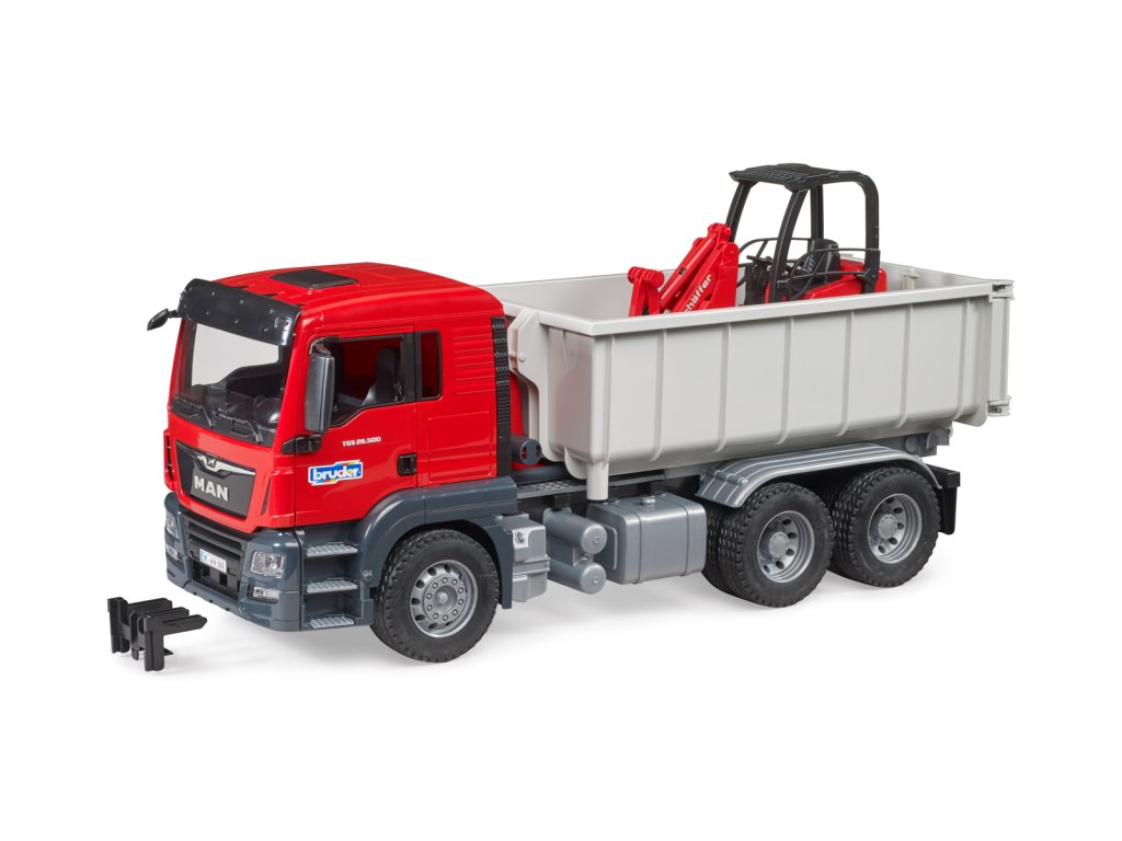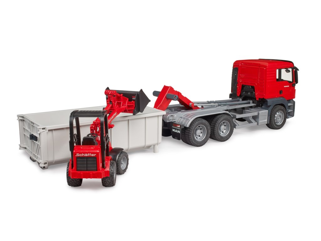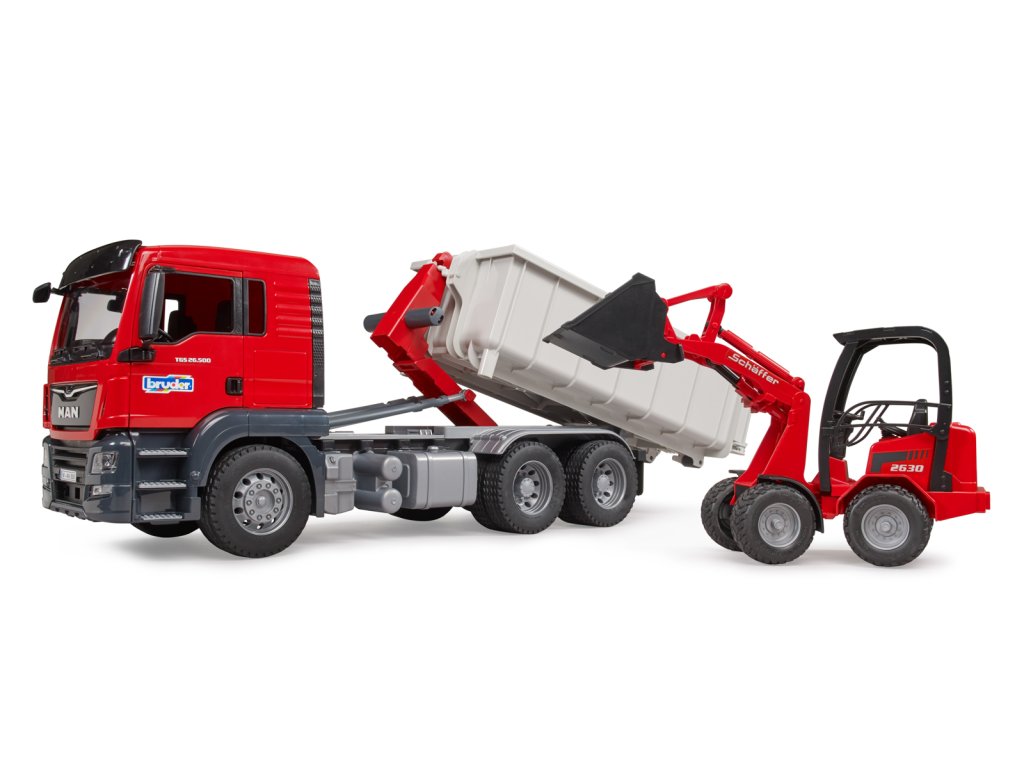 MAN TGS je perfektní všestranný vůz pro staveniště, dálkovou dopravu a místní distribuci. Robustně postavený, vybavený motory s vysokým točivým momentem a nadprůměrným užitečným zatížením je tento nákladní vůz prototypem tolik popisovaného „všestranného vozu“, který má na palubě spoustu inovací. Dvoubarevná kabina řidiče má dveře, které lze otevřít a nabízí každé postavě bworld moderní pracoviště. Rolovací kontejner má na konci dvě otočná křídlová dvířka a lze je odložit a zvedat dozadu pomocí chapadla. Když je kontejner na zemi a dveře jsou otevřené, mohou menší vozidla BRUDER dokonce vjet do kontejneru a poté být přepravena kontejnerovým vozem. Tato možnost se velmi často využívá i ve skutečnosti na stavbách a malí stavitelé mohou tyto flexibilní možnosti napodobit. Všeobecně oblíbený farmářský nakladač Schäffer je nyní součástí této skvělé kombinace. Balení: 19,5x28x59cm. Věk: 3+
