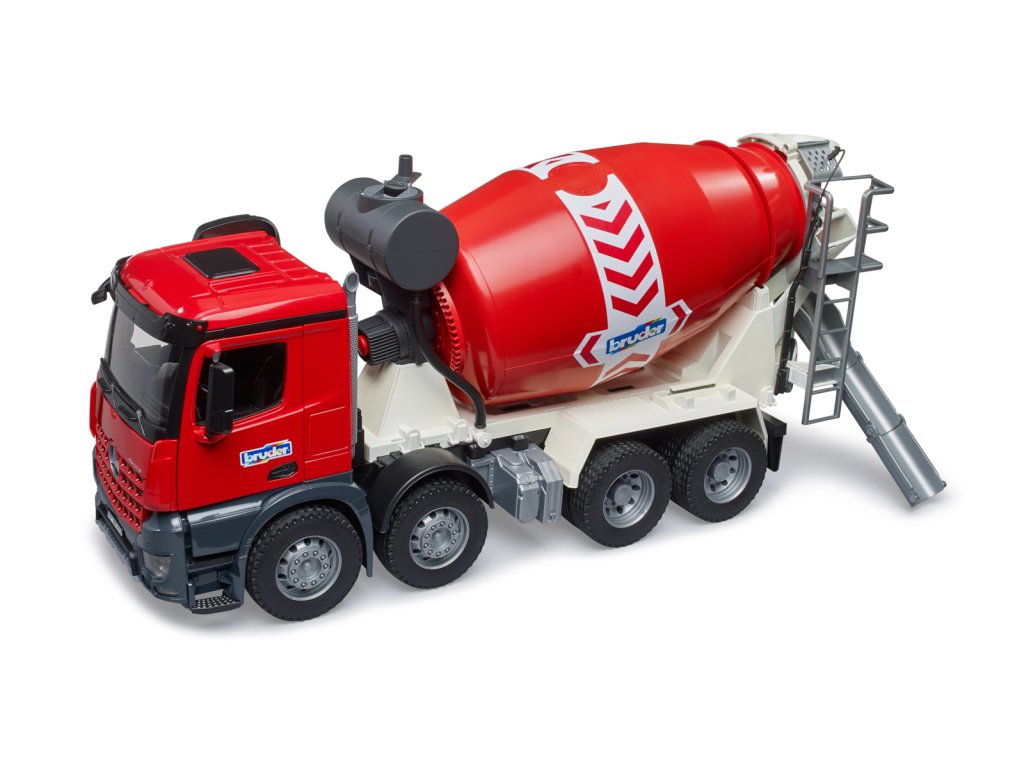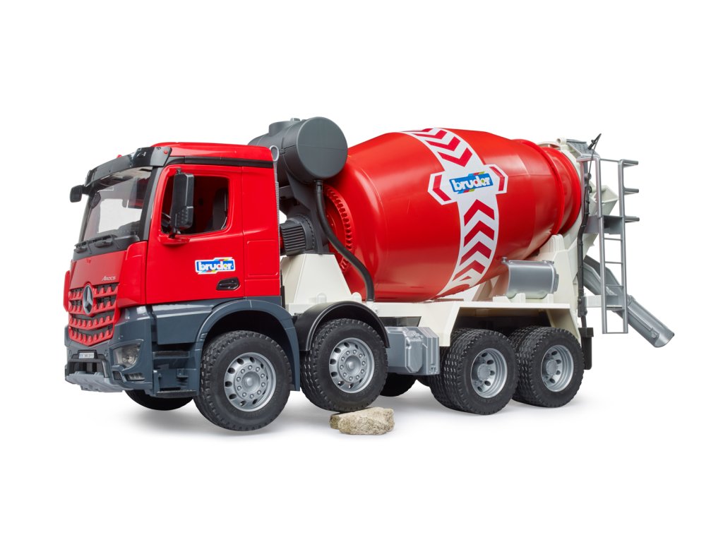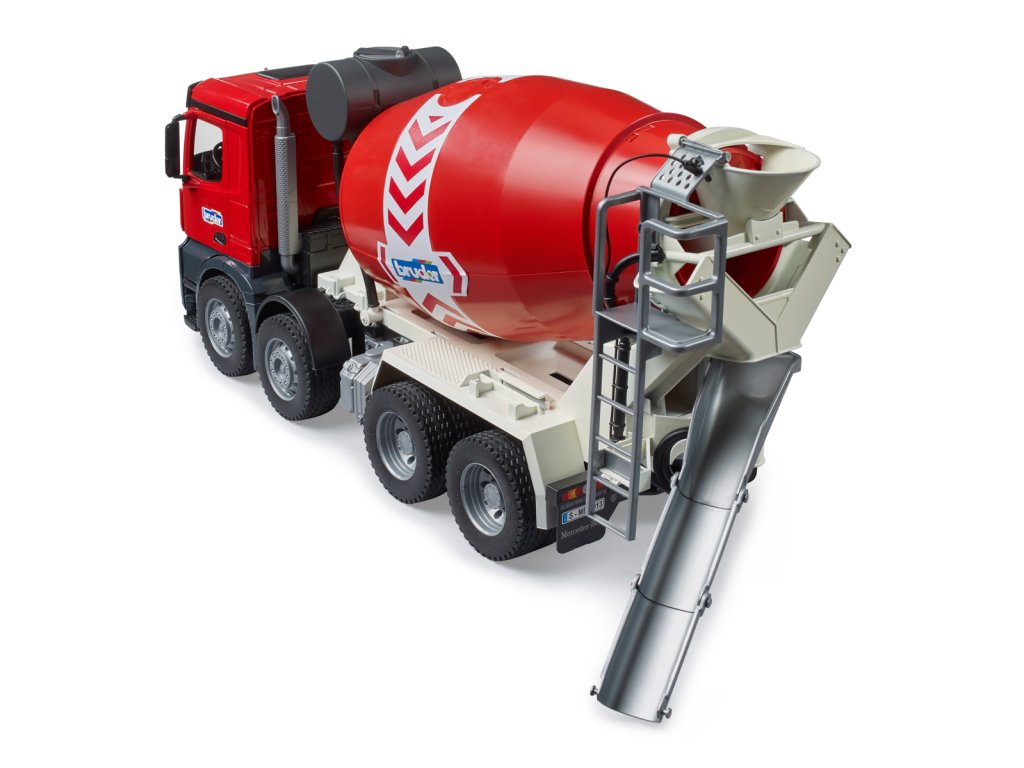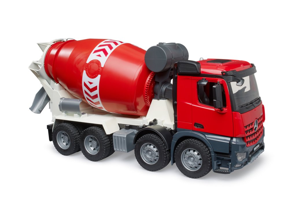 Výkon, robustnost a efektivita jsou často rozhodující při každodenní práci na silnicích a na stavbách. Nový MB Arocs byl proto speciálně vyvinut pro tyto potřeby. Kromě těchto technických vlastností byl také odpovídajícím způsobem upraven design. Například přední část masky chladiče je navržena v typickém vzhledu Arocs, který má vyjadřovat obrovskou sílu. I u tohoto modelu byl kladen velký důraz na robustnost a kabina řidiče byla vybavena otevíratelnými dveřmi. Buben míchačky betonu lze otáčet pomocí ruční kliky, kterou lze v nádrži na vodu (buben s dopravním a míchacím šnekem) vyklopit. Stejně jako u originálu se buben vyprazdňuje obrácením směru otáčení. Šnek uvnitř bubnu pak dopravuje produkt zpět do vyhazovacího žlabu. Součástí dodávky jsou dvě vypouštěcí desky k připevnění. Rozměry: 19,5x29x66,5cm. Věk: 3+
