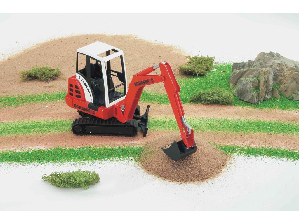 Konstrukční vozy - SCHAEFF HR16 mini bagr 1:16. Tento model minibagru je u dětí velmi oblíbený především díky plně funkčnímu bagrovacímu ramenu. Lžíce bagru se dá dle přání odejmout a přední radlice dle potřeby nastavit. Kabina je otočná až o 360 stupňů a gumový pás umožňuje snadný pohyb dopředu i dozadu i v náročnějším terénu. Celý model je vyroben z vysoce kvalitního plastu a vhodný pro exteriér i interiér. K tomuto modelu doporučujeme dokoupit příslušenství pod číslem 02408 pro rozšíření hracích kombinací. Rozměry 350 x 160 x 100 Upozornění: Toto zboží není určeno pro distribuci v ČR.