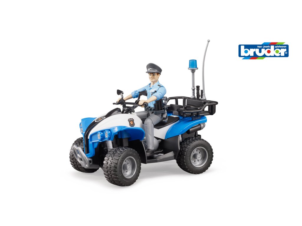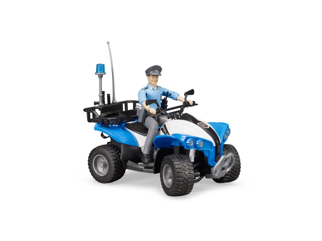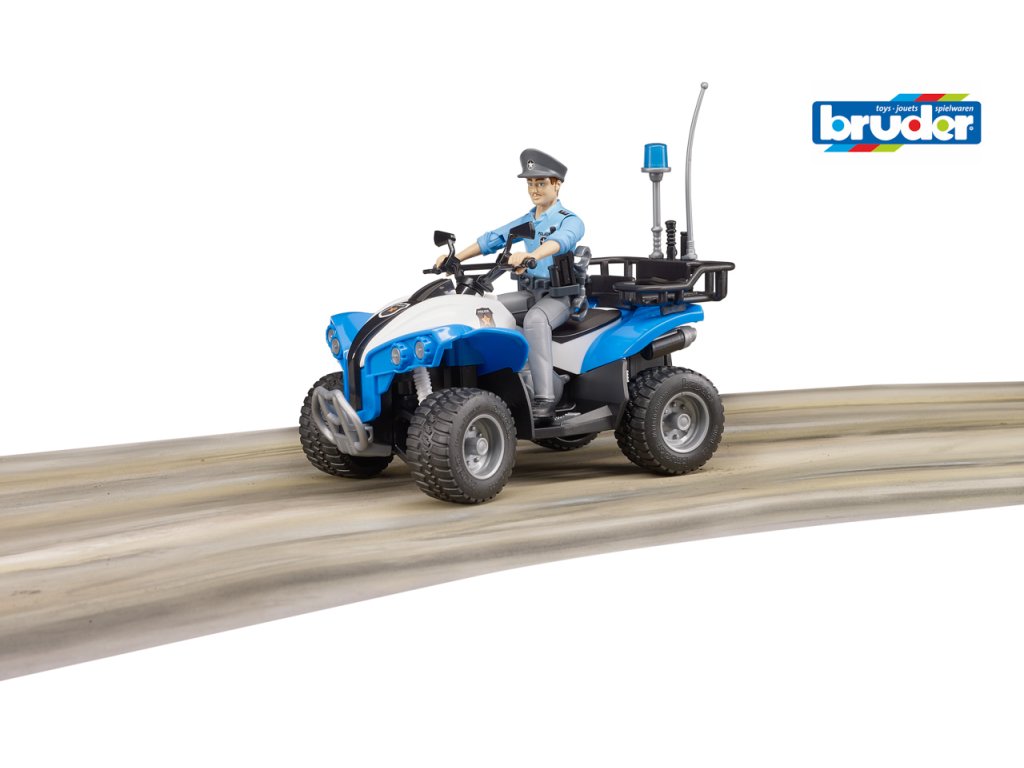 Policejní čtyřkolka s policistou. Ne všude se dá projet s autem, a tak má policie i menší vozidla – čtyřkolky. Čtyřkolka je ideální pohotovostní vozidlo pro každodenní činnosti a poradí si i v náročném terénu při pronásledování zločince. V zadní části je dostatek prostoru na odnímatelném držáku zavazadel, tažné zařízení a držáky nástrojů. Odpružená přední a zadní náprava. Pevná rukojeť na řídítkách a sedadlo ve sportovní poloze. Policejní důstojník je vybaven opaskem s důležitými pracovními nástroji jako je obušek, vysílačka nebo svítilna. Vozidlo je vyrobeno z kvalitního plastu, vhodné do interiéru i exteriéru. Obsahuje: 1x čtyřkolka, 1x policista. Měřítko: 1:16. Rozměr: 160 x 93 x 93 mm. Věk: 4+