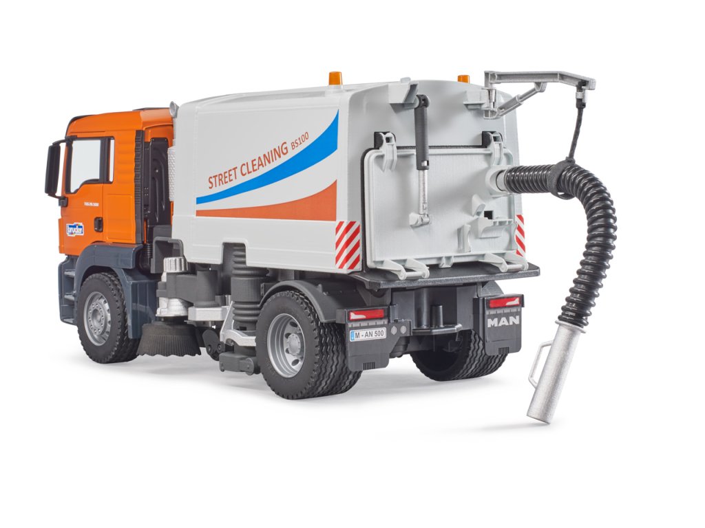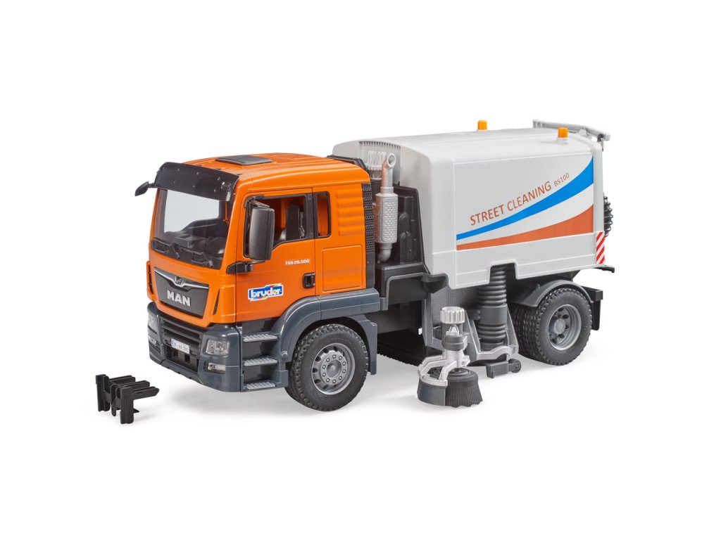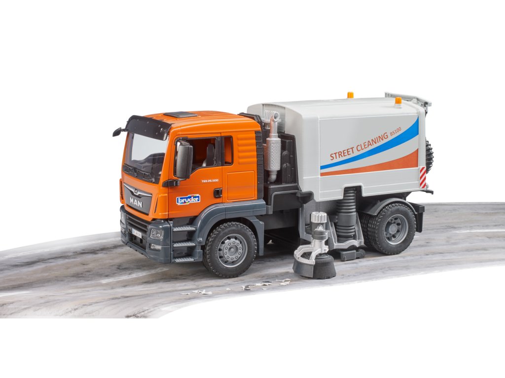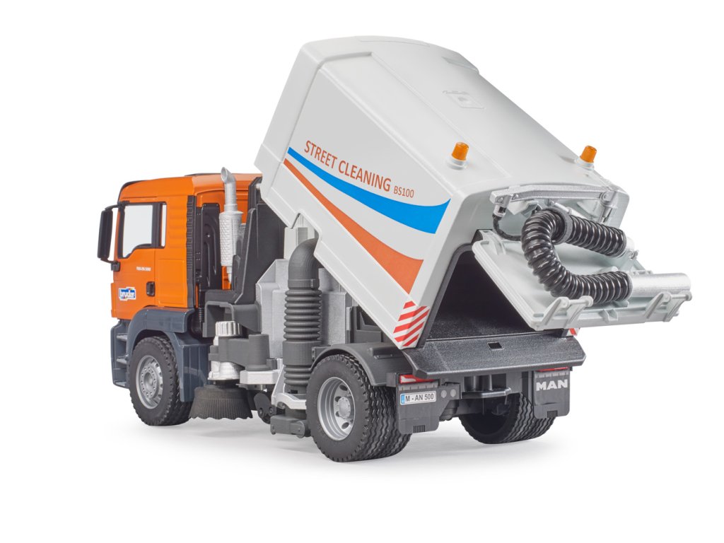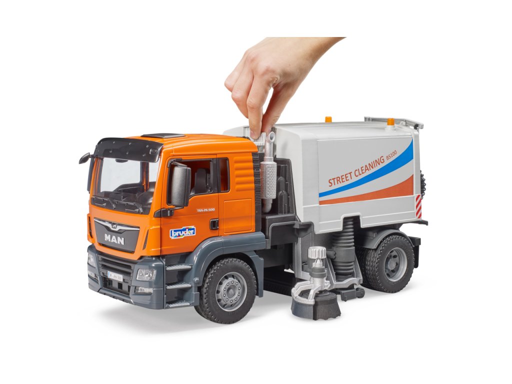 MAN TGS pouliční zametací auto je nepostradatelným pomocníkem pro každé město a je jeho každodenní součástí. MAN TGS pouliční zametací auto od firmy BRUDER je robustně postavené, vybavené výkonným motorem s výkonem až 500 HP. Zametací auto má 2 otočné kartáče, které lze výškově nastavit, a to jim umožňuje dosáhnout na obtížně dostupná místa. Pod vozidlem je instalovaný dlouhý čistící kartáč, který je poháněn za jízdy. Na zadní straně auta je ohebná hadice se sací trubkou, která zachytí mnoho nečistot. Pro vyprázdnění odpadní nádoby auta je možné jednoduše zadní část sklopit. Zadní dveře odpadní nádoby lze otevřít. Kabina řidiče je vyrobena z průhledného a vysoce kvalitního plastu. Vnější zrcátka jsou sklopná, dveře kabiny lze otevřít. Hračka je vhodná pro hru uvnitř i venku. Rozměr balení: 19,5 x 27 x 52 cm. Doporučený věk: 4+