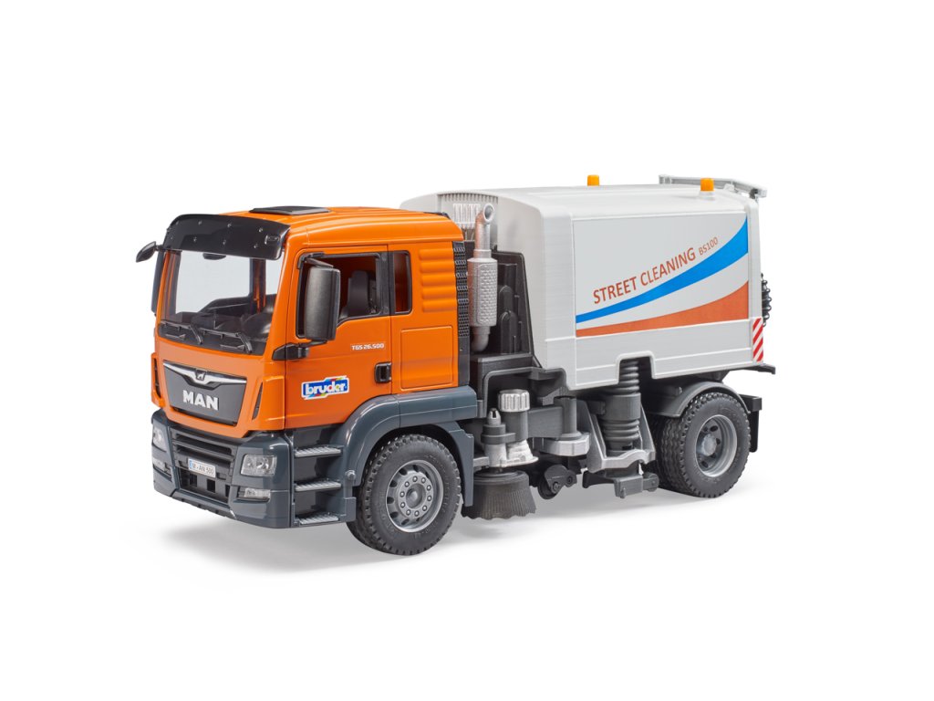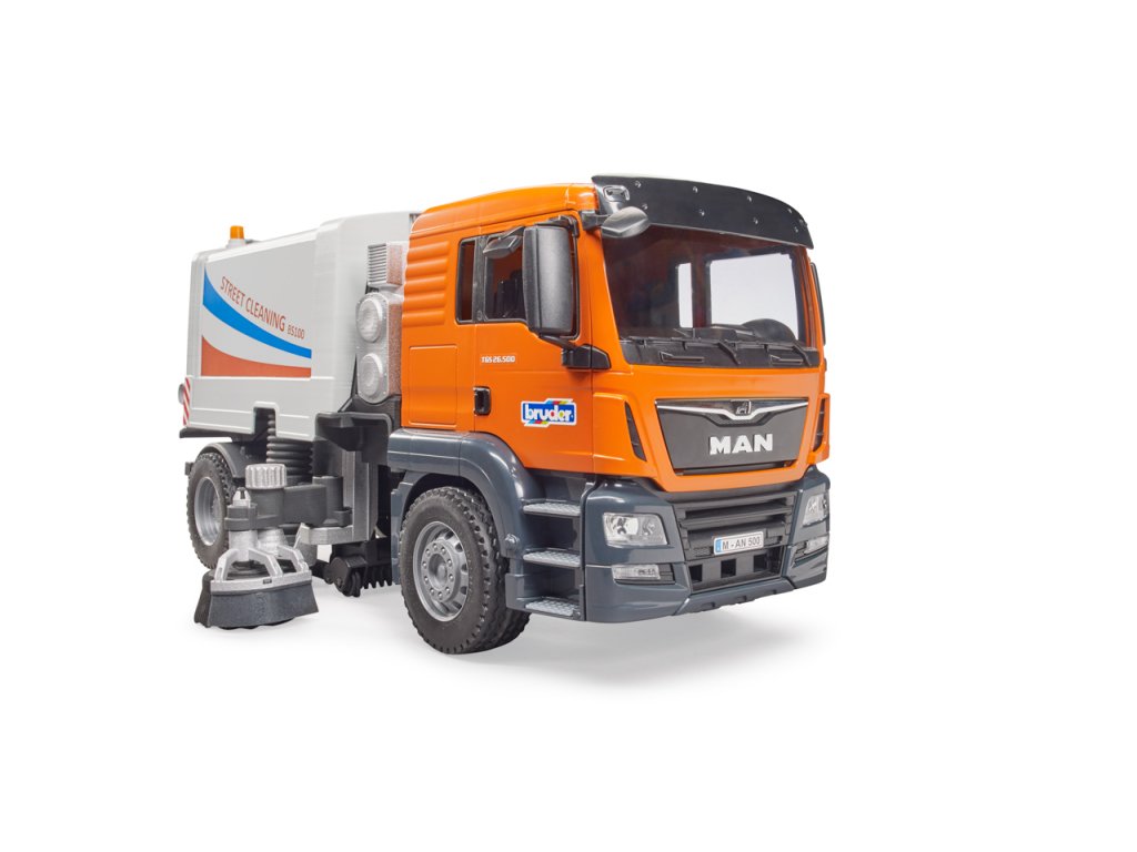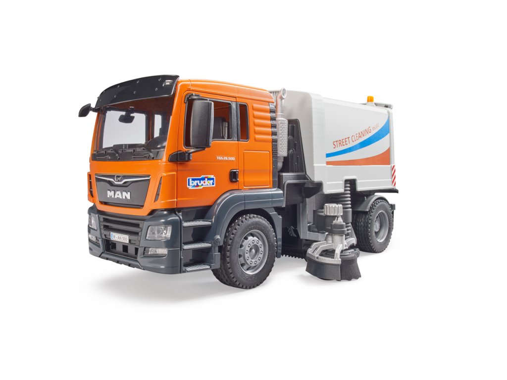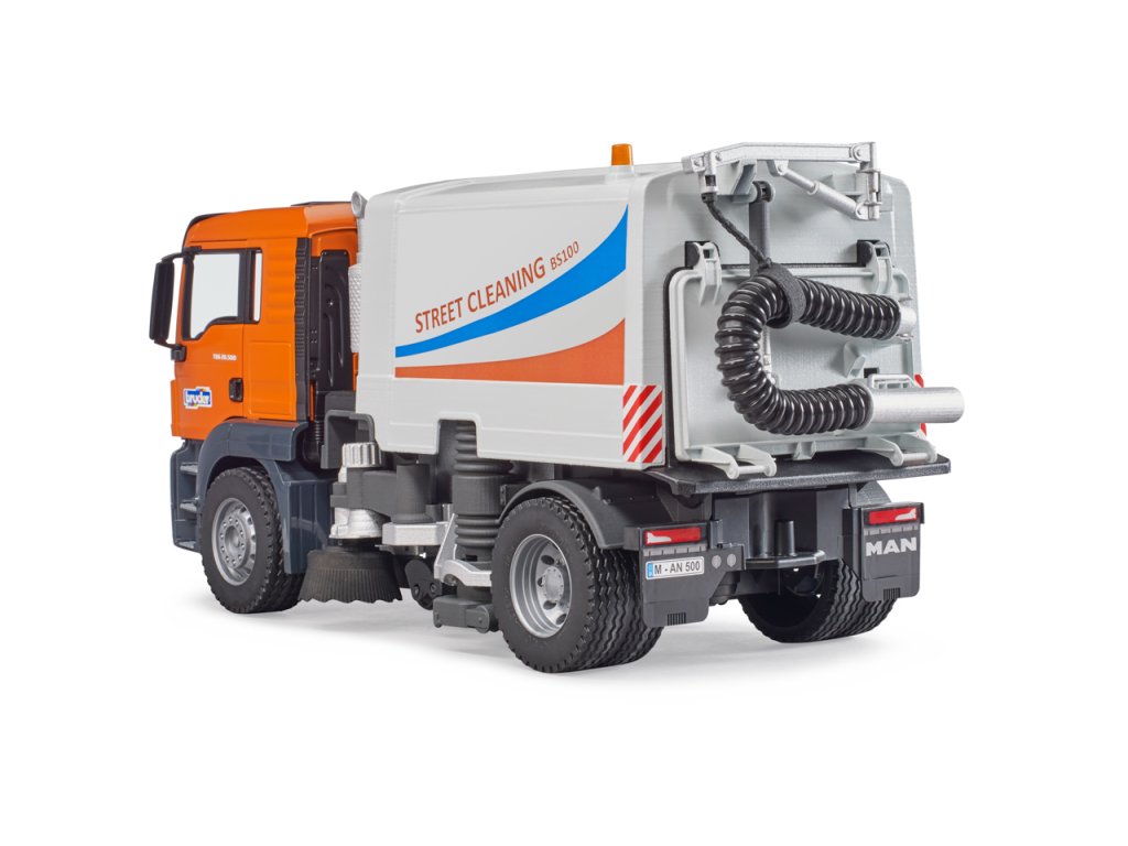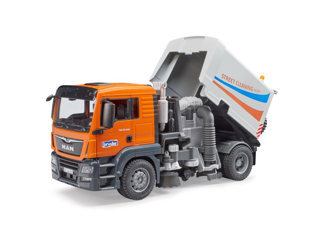 MAN TGS pouliční zametací auto je nepostradatelným pomocníkem pro každé město a je jeho každodenní součástí. MAN TGS pouliční zametací auto od firmy BRUDER je robustně postavené, vybavené výkonným motorem s výkonem až 500 HP. Zametací auto má 2 otočné kartáče, které lze výškově nastavit, a to jim umožňuje dosáhnout na obtížně dostupná místa. Pod vozidlem je instalovaný dlouhý čistící kartáč, který je poháněn za jízdy. Na zadní straně auta je ohebná hadice se sací trubkou, která zachytí mnoho nečistot. Pro vyprázdnění odpadní nádoby auta je možné jednoduše zadní část sklopit. Zadní dveře odpadní nádoby lze otevřít. Kabina řidiče je vyrobena z průhledného a vysoce kvalitního plastu. Vnější zrcátka jsou sklopná, dveře kabiny lze otevřít. Hračka je vhodná pro hru uvnitř i venku. Rozměr balení: 19,5 x 27 x 52 cm. Doporučený věk: 4+