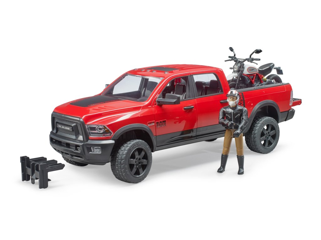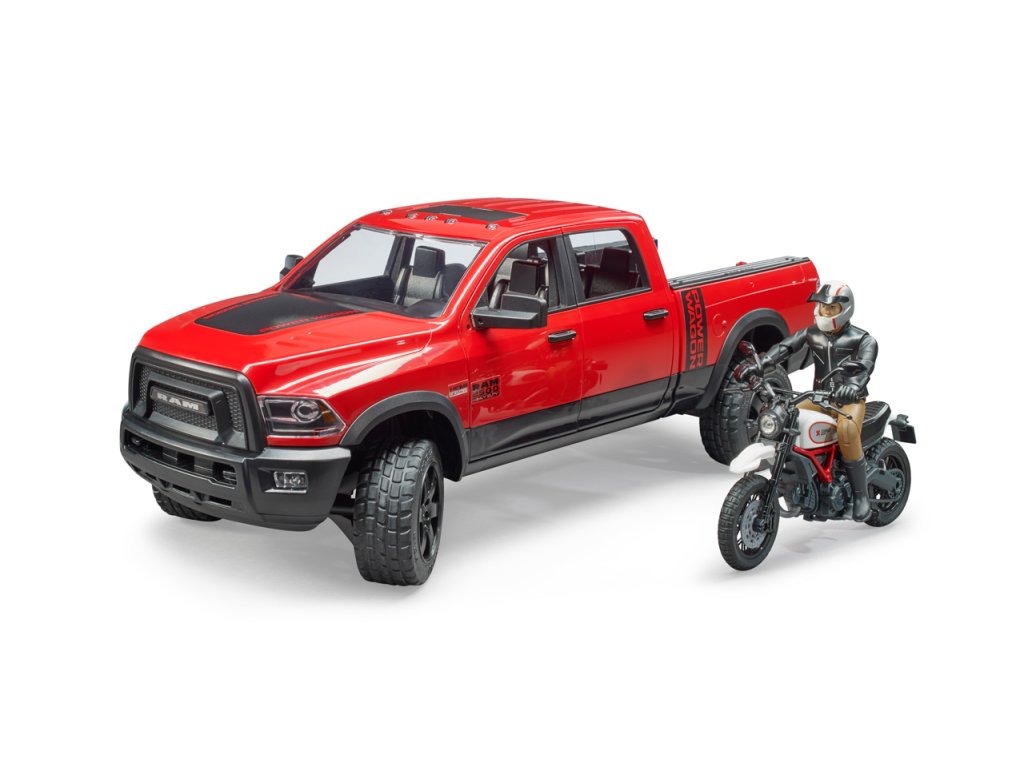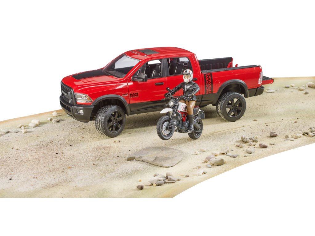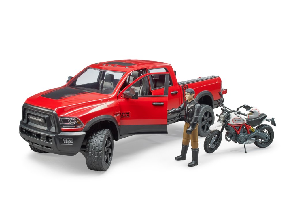 Pro mnoho lidí je motocykl čistá vášeň. Ducati je prémiová značka motocyklů. RAM je ideální pro terénní přepravu, motorku Ducati snadno uveze na ložné ploše. Jeho robustnost a terénní schopnosti jsou legendární a dodnes jedinečné. Tento vůz je obzvláště působivý, pokud jde o výkon. Jeho motor V8 HEMI má výkon 410 koní a točivý moment 582 Newton metrů. Všechny dveře lze otevřít a nabízejí prostor pro 4 figurky bworld. Pro pohodlnou jízdu a mobilitu v terénu je tento model v měřítku 1:16 vybaven odpruženými nápravami, přičemž přední nápravu lze řídit pomocí přiloženého prodloužení volantu. Model Ducati přijímá designové prvky, jako jsou kola s drátěnými paprsky, výfuk nebo motokrosové prvky. Motocykl Ducati je na ložné ploše upevněna řidičem pomocí dodávaných přepravních konzol. Vhodné pro hru doma i venku. Ram – čiré skleněné přední světlomety, okna kabiny jsou z průhledného, nerozbitného plastu, dveře se otevírají, prostor pro palety či jiný náklad na ložné ploše, možnost připojení příslušenství BRUDER, dveře zavazadlového prostoru lze otevřít. Řidič je oblečen ve stylovém oblečení s helmou a rukavicemi. Motocykl – s řiditelnou přední vidlicí, odpruženým otočným ramenem vzadu a sklopným bočním stojanem, kola s moderním designem SUV, odpružená přední (řiditelná) a zadní náprava, odnímatelná spojka přívěsu. Vyrobeno z vysoce kvalitních plastů. Měřítko: 1:16. Věk: 4+. Obsahuje: 1 RAM 2500, 1 motocykl Ducati, 1 řidič.