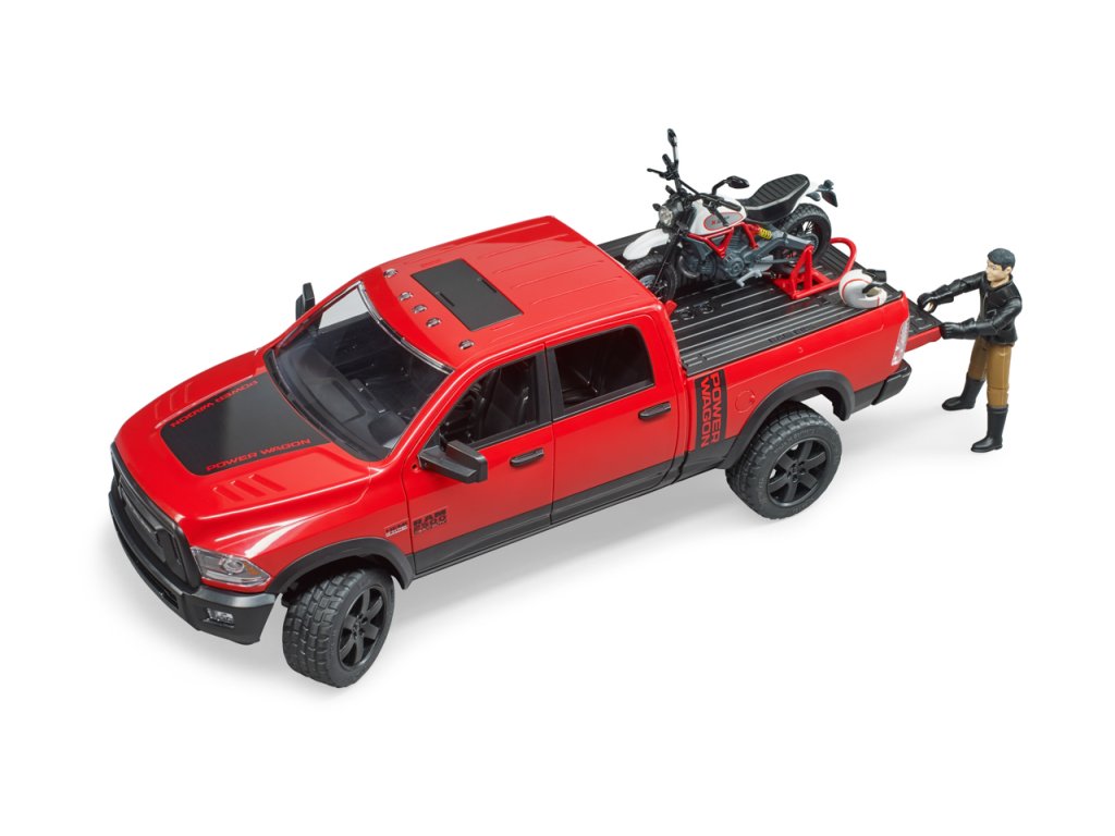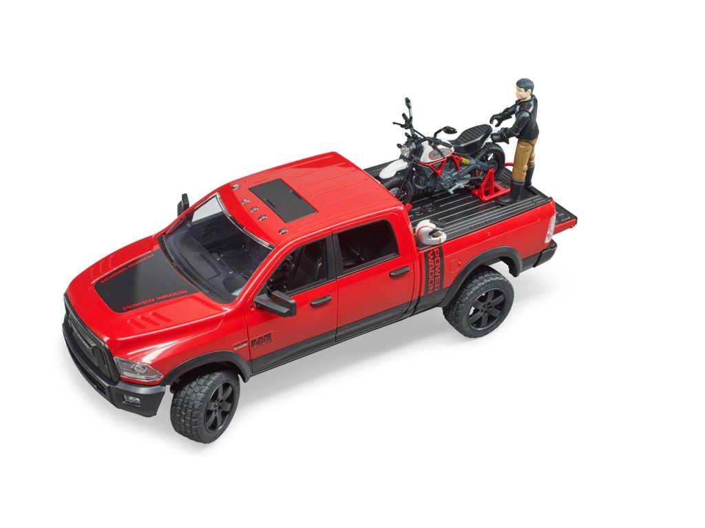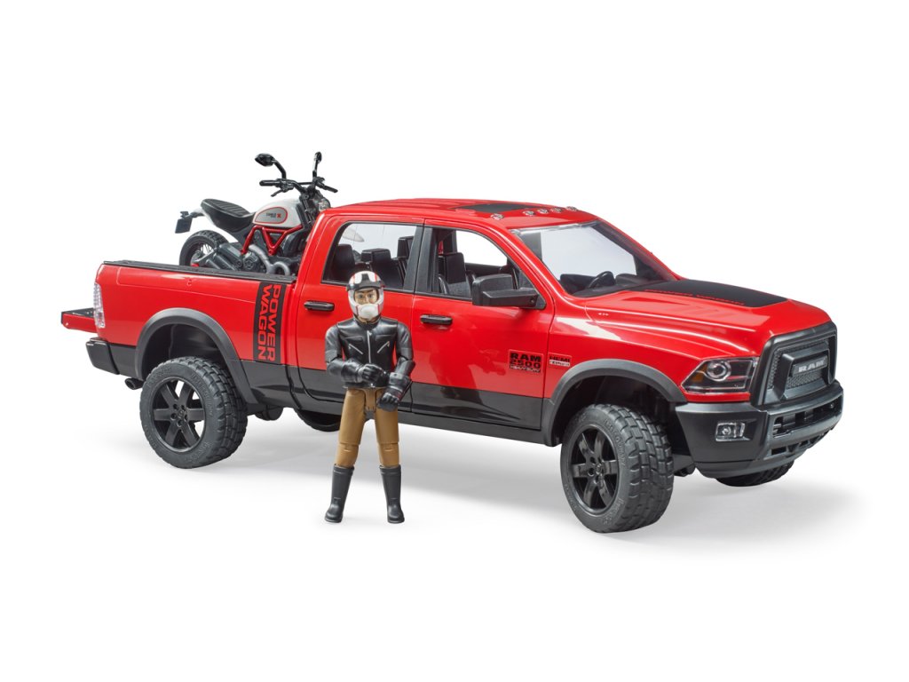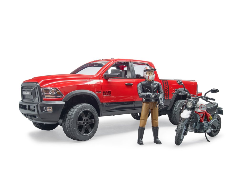 Pro mnoho lidí je motocykl čistá vášeň. Ducati je prémiová značka motocyklů. RAM je ideální pro terénní přepravu, motorku Ducati snadno uveze na ložné ploše. Jeho robustnost a terénní schopnosti jsou legendární a dodnes jedinečné. Tento vůz je obzvláště působivý, pokud jde o výkon. Jeho motor V8 HEMI má výkon 410 koní a točivý moment 582 Newton metrů. Všechny dveře lze otevřít a nabízejí prostor pro 4 figurky bworld. Pro pohodlnou jízdu a mobilitu v terénu je tento model v měřítku 1:16 vybaven odpruženými nápravami, přičemž přední nápravu lze řídit pomocí přiloženého prodloužení volantu. Model Ducati přijímá designové prvky, jako jsou kola s drátěnými paprsky, výfuk nebo motokrosové prvky. Motocykl Ducati je na ložné ploše upevněna řidičem pomocí dodávaných přepravních konzol. Vhodné pro hru doma i venku. Ram – čiré skleněné přední světlomety, okna kabiny jsou z průhledného, nerozbitného plastu, dveře se otevírají, prostor pro palety či jiný náklad na ložné ploše, možnost připojení příslušenství BRUDER, dveře zavazadlového prostoru lze otevřít. Řidič je oblečen ve stylovém oblečení s helmou a rukavicemi. Motocykl – s řiditelnou přední vidlicí, odpruženým otočným ramenem vzadu a sklopným bočním stojanem, kola s moderním designem SUV, odpružená přední (řiditelná) a zadní náprava, odnímatelná spojka přívěsu. Vyrobeno z vysoce kvalitních plastů. Měřítko: 1:16. Věk: 4+. Obsahuje: 1 RAM 2500, 1 motocykl Ducati, 1 řidič.