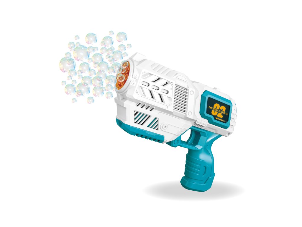 Bublifuk pistole. Rozměry pistole 19,5x14,7x5,8 cm. Nádržka o objemu 50 ml. baterie 4xAA nejsou součástí