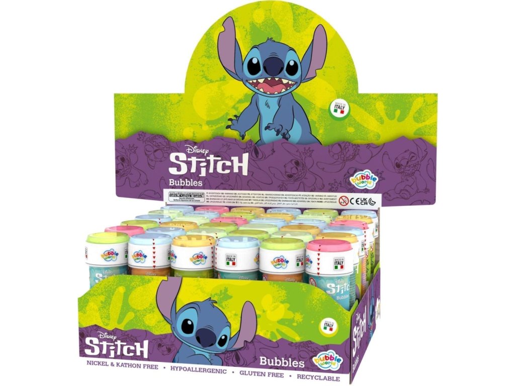 Bublifuk s motivem STITCH o obsahu 300 ml. Součástí barevného víčka je hra a foukátko. Lze zakoupit i jako celý display, kde je 12