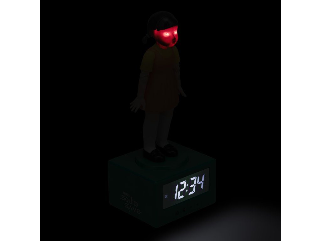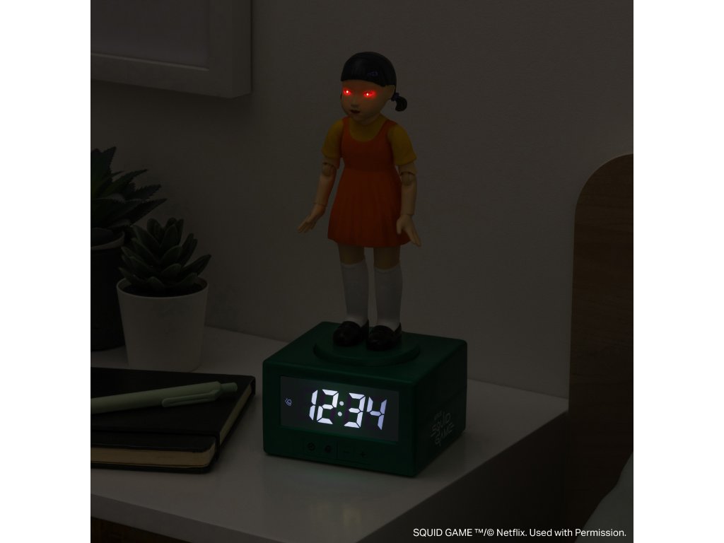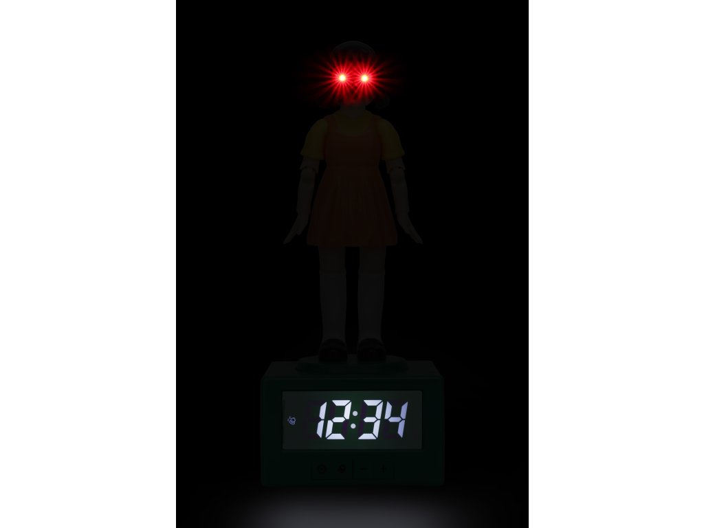 Digitální svítící 3D stolní budík ve tvaru šokující panenky z oblíbeného jihokorejského seriálu Hra na oliheň. S tímto budíkem se budete budit jedna báseň. Ihned po probuzení touto panenkou vyskočíte z postele a budete rychle připraveni do nového dne každodenního života. Budík je vhodný pro všechny fanoušky tohoto dramatického seriálu.
