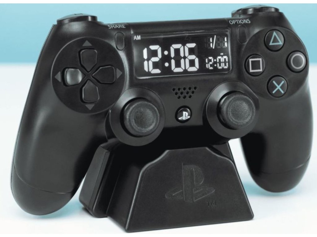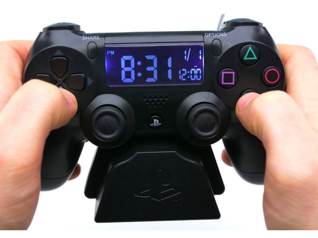 Digitální stolní budík ve tvaru ovladače k herní konzoli Playstation.
