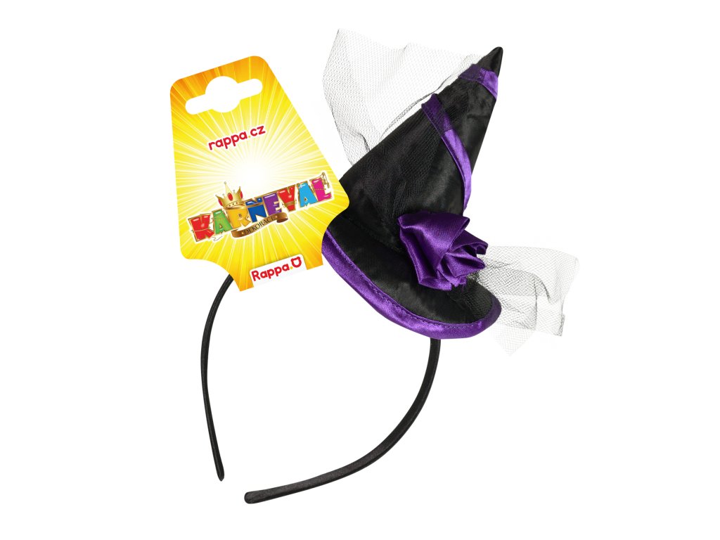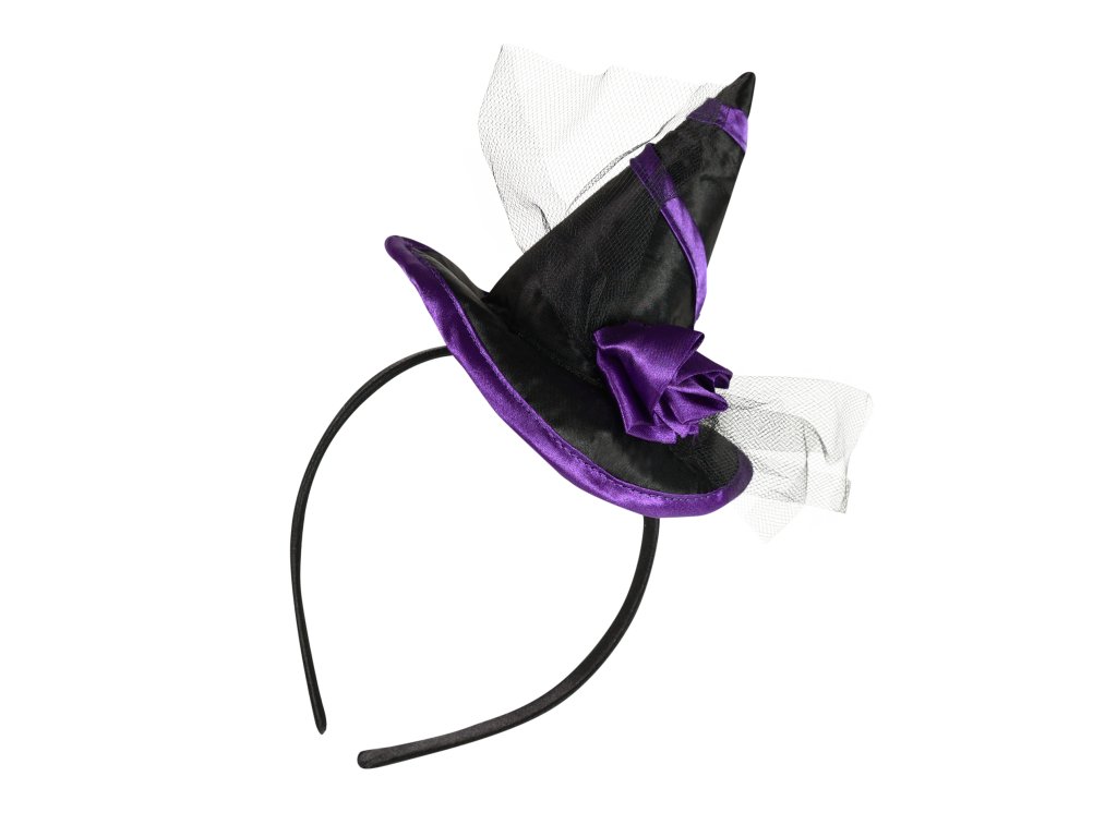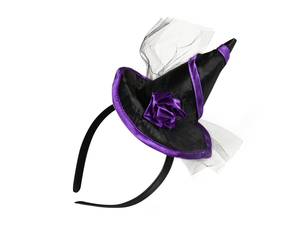 Stylová čelenka je perfektním doplňkem na večírek nebo Halloween párty! Černo-fialová čelenka je doplněna saténovým mini kloboučkem a tylovou ozdobou s květinou.