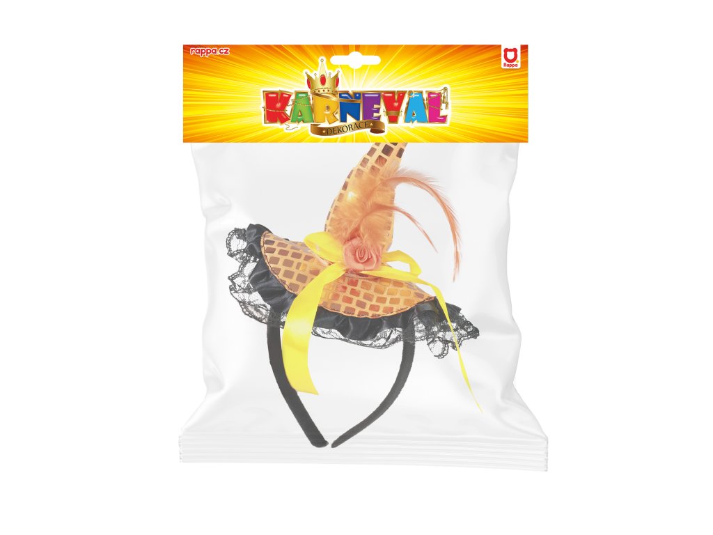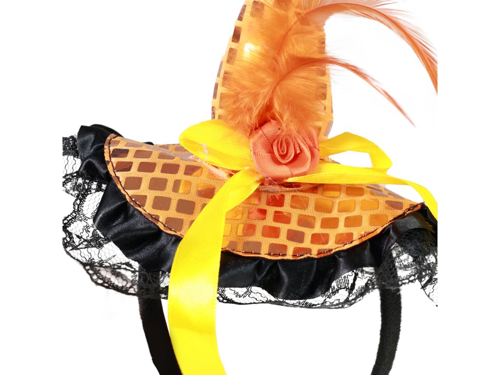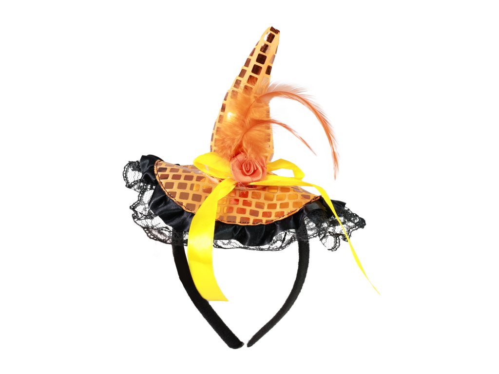 Nepřehlédnutelná čelenka s mini kloboučkem v oranžové barvě a černou krajkou je senzačním doplňkem na párty či karneval. Ideální ozdoba do vlasů při oslavě čarodějnic nebo Halloweenu.