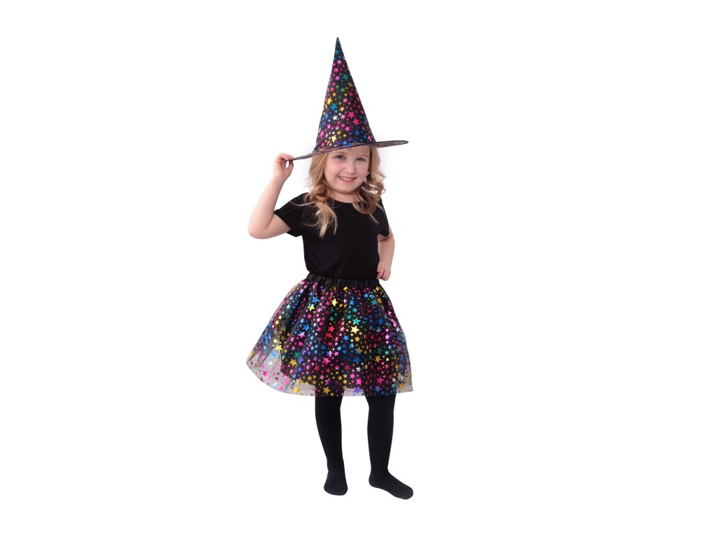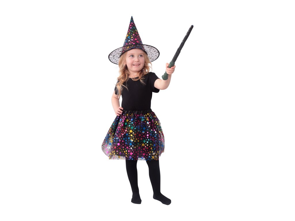 Magický kostýmek pro malé čarodějnice v černé barvě, zdobený barevným dekorem hvězdiček. Kostým je určen pro holčičky ve věkovém rozmezí 3-7 let. Balení obsahuje nadýchanou sukničku a k tomu perfektně sladěný klobouk. Délka sukýnky je cca 30 cm. Sukně je v pase na gumičku. Vhodný i na oslavu Halloweenu.