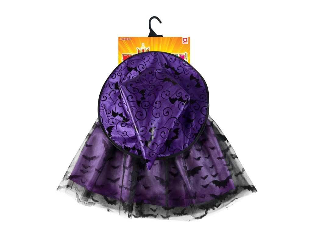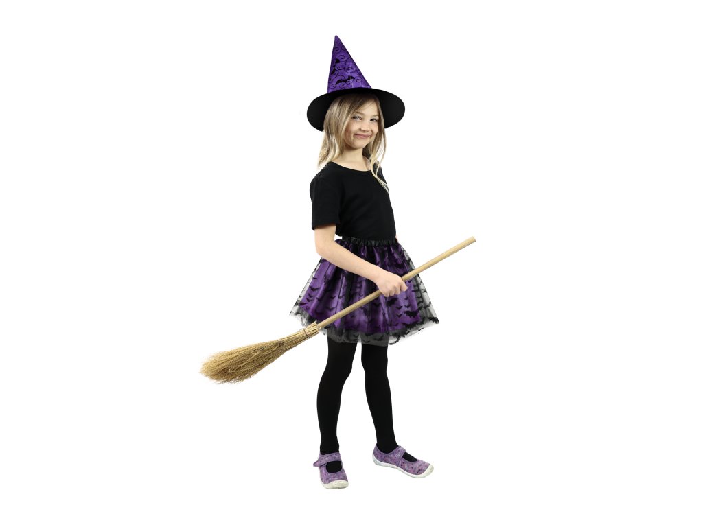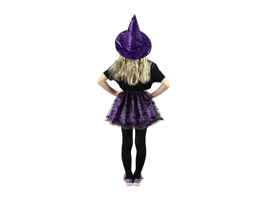 Magický kostýmek pro malé čarodějnice ve fialové barvě, zdobený černým potiskem netopýrů. Kostým je určen pro holčičky ve věkovém rozmezí 3-7 let. Balení obsahuje nadýchanou sukničku a k tomu perfektně sladěný klobouk. Délka sukýnky je cca 30 cm. Sukně je v pase na gumičku. Vhodný i na oslavu Halloweenu.