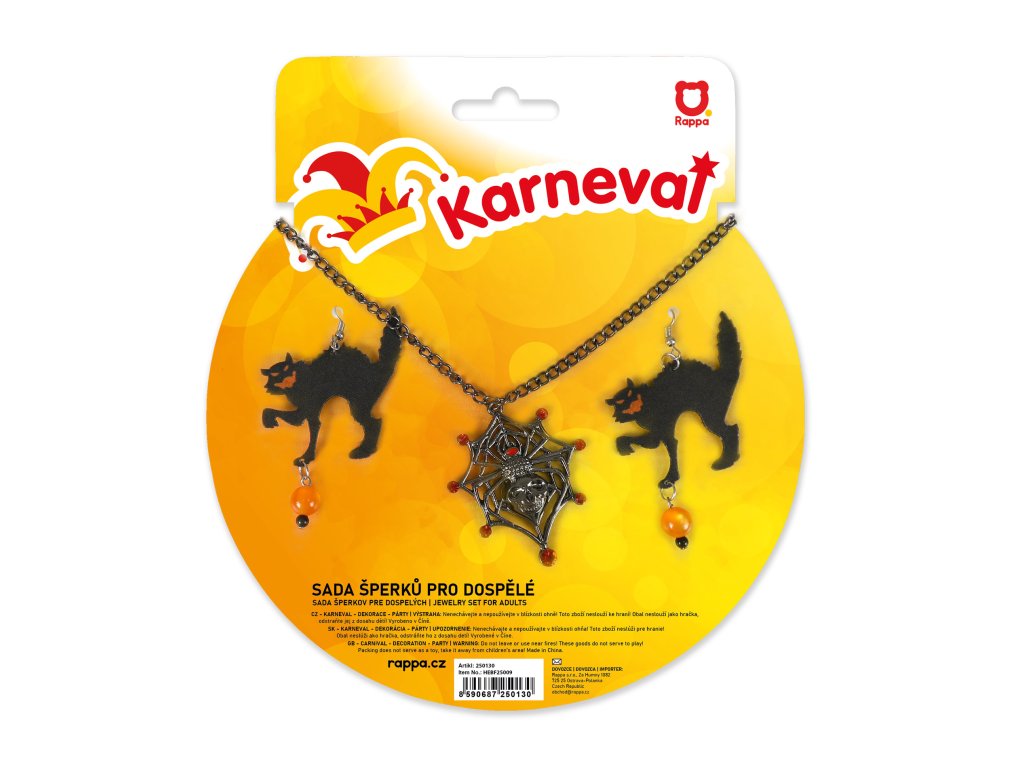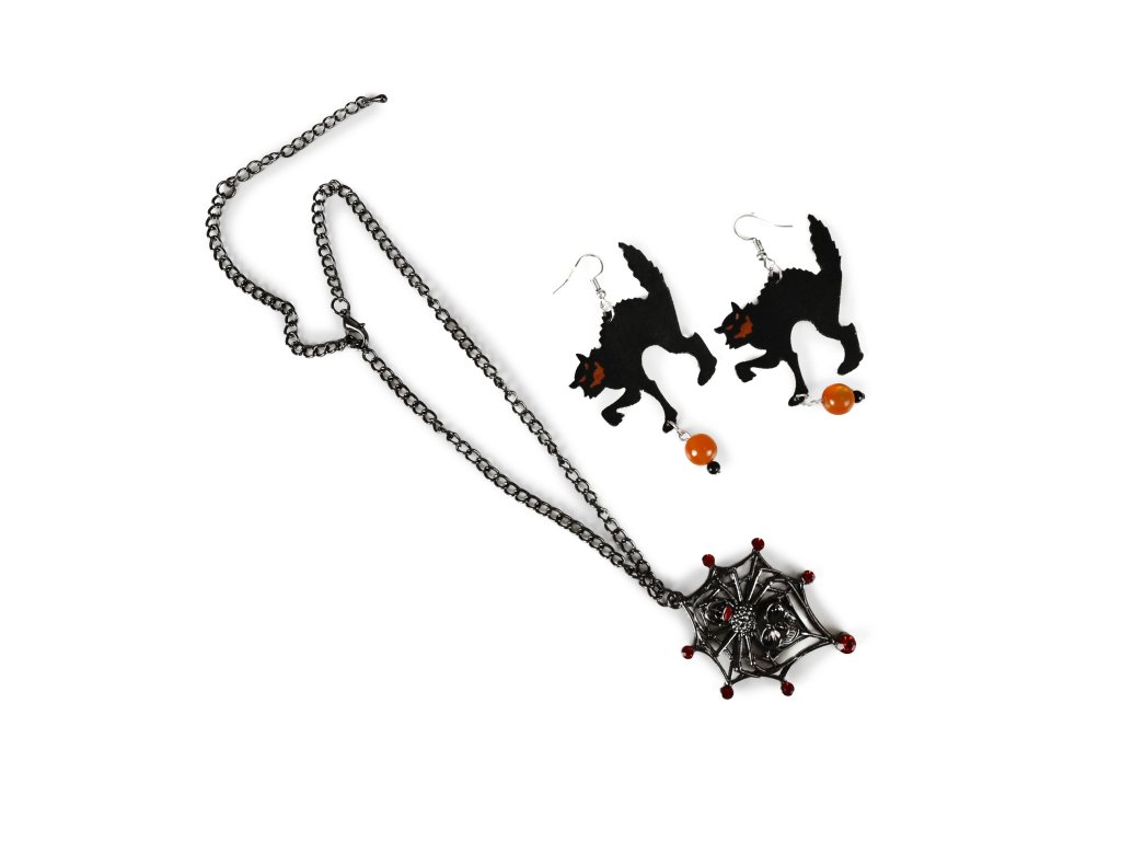 Doplňte svůj strašidelný outfit touto tajemnou sadou šperků, která je jako stvořená pro Halloween nebo oslavu čarodějnic! Sada obsahuje elegantní náhrdelník s detailně zpracovaným pavoukem, který dodá vašemu vzhledu temnou eleganci, a náušnice s mystickými kočkami, jež jsou symbolem magie a tajemství.