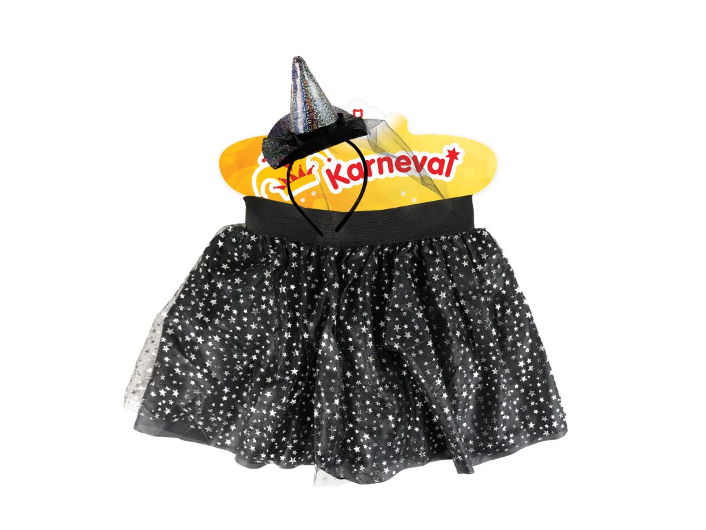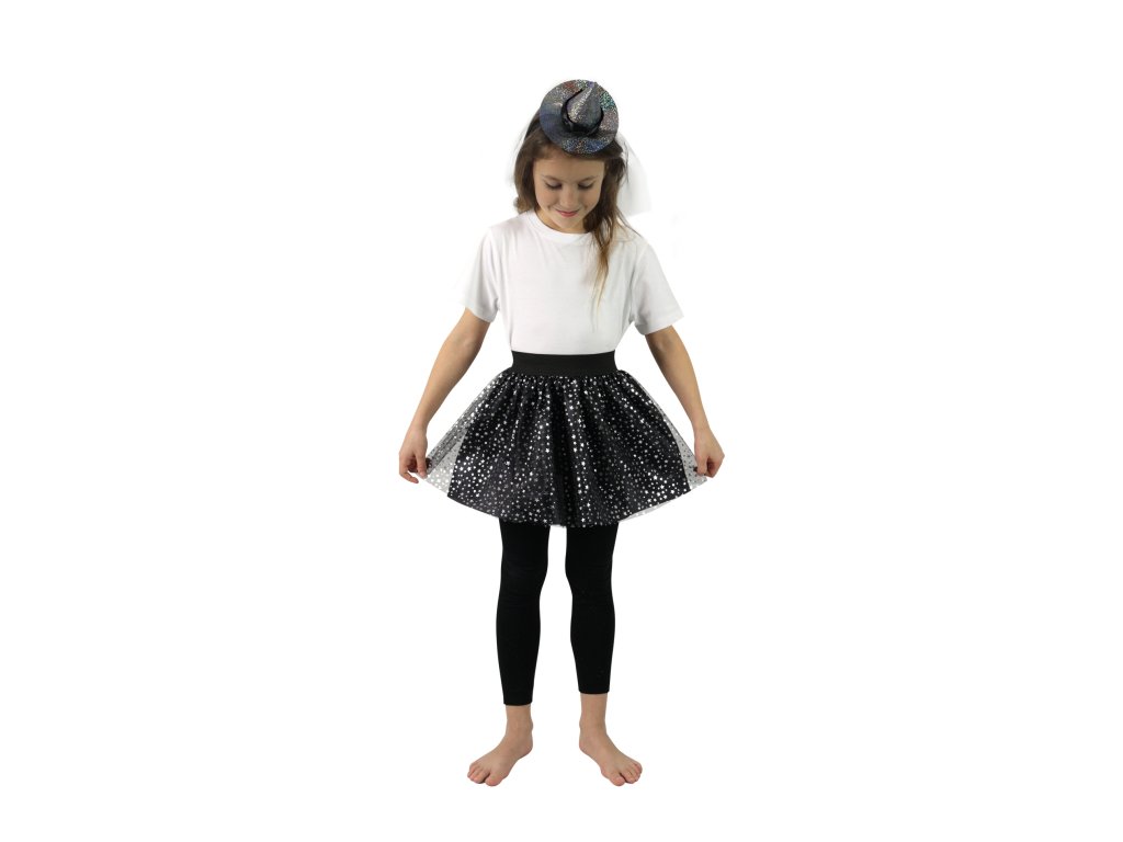Bezva sada pro všechny malé parádnice čarodějnice! Sukýnka má černou spodničku, překrytou tylem s potiskem stříbrných hvězdiček. Je určena pro holčičky ve věkovém rozmezí 3-7 let. Délka sukně je 28 cm. Set je doplněn o čelenku s kloboučkem, který perfektně ladí k sukýnce. Skvěle se hodí i na oslavu Halloweenu nebo karneval!