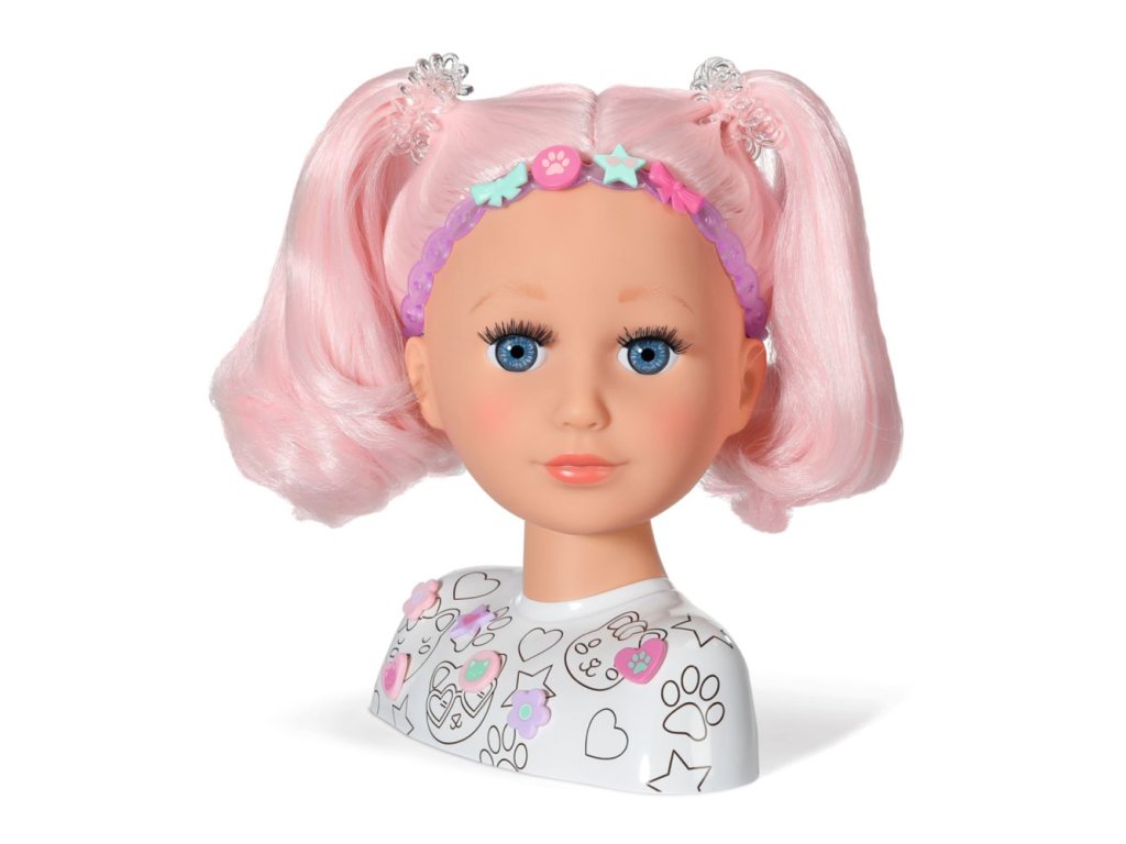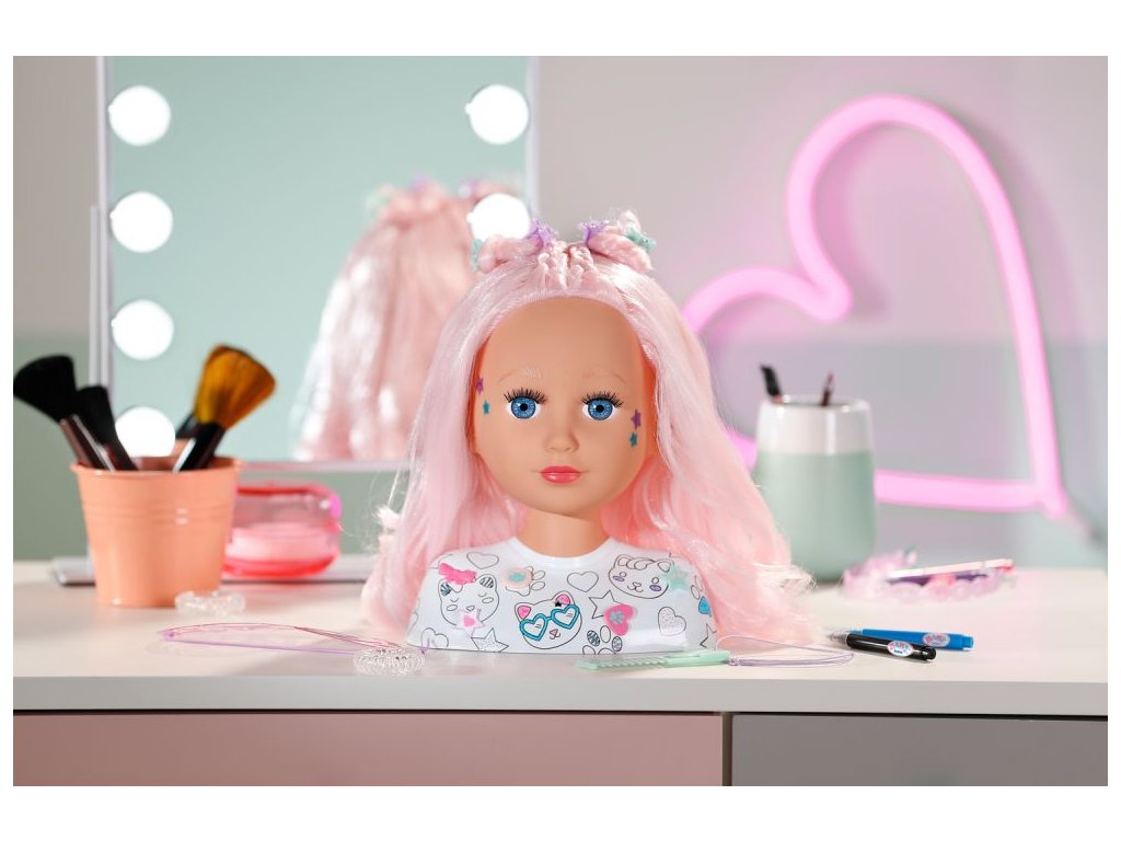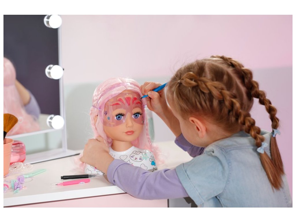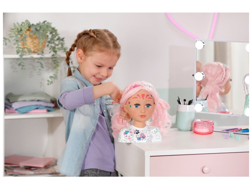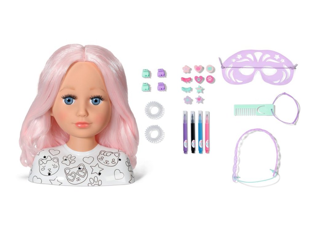 S BABY born Kreativní česací hlavou se fantazii a kreativitě meze nekladou. Česací hlavu vysokou 22 cm lze nalíčit a namalovat pomocí dodaných fixů a šablony. Ale to není vše: vybarvit lze i tričko panenky. Tričko můžete také dozdobit některými z 10 nacvakávacích ozdob. Zlatým hřebem jsou samozřejmě dlouhé růžové vlasy z vysoce kvalitního nylonu. Pomocí doplňků z balení lze vykouzlit ty nejúžasnější účesy. Čelenku do vlasů můžete také ozdobit barevnými nacvakávacími ozdobami.