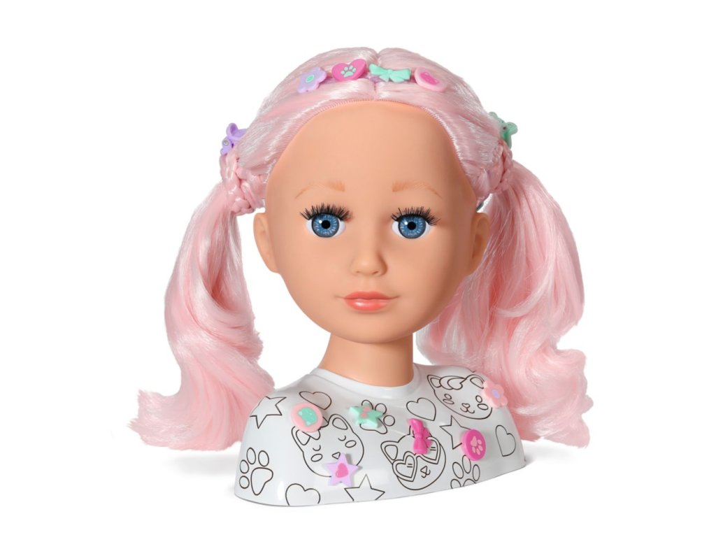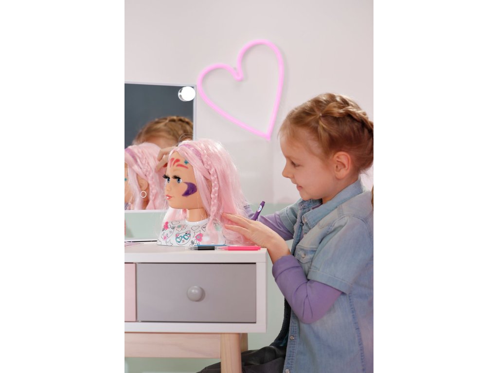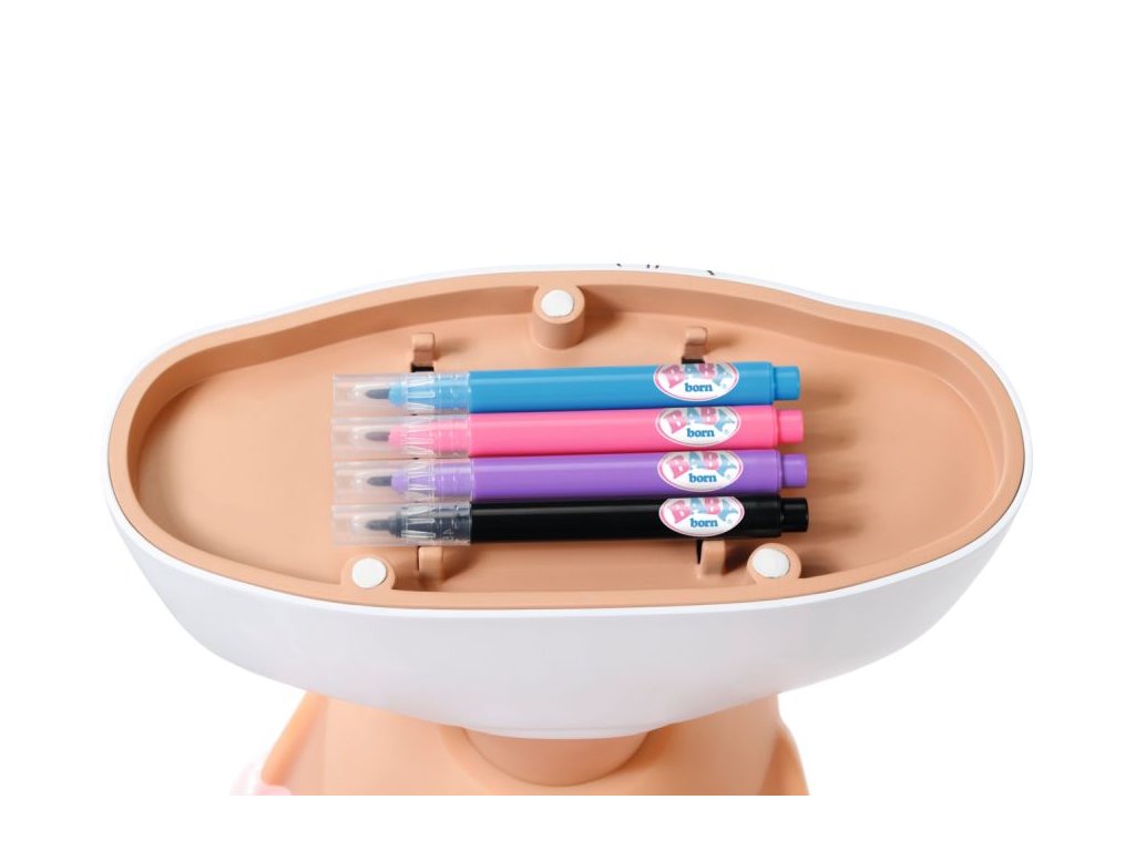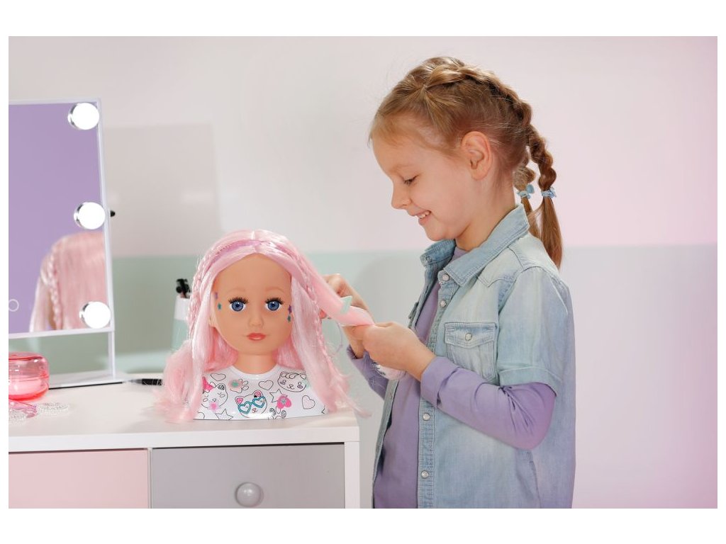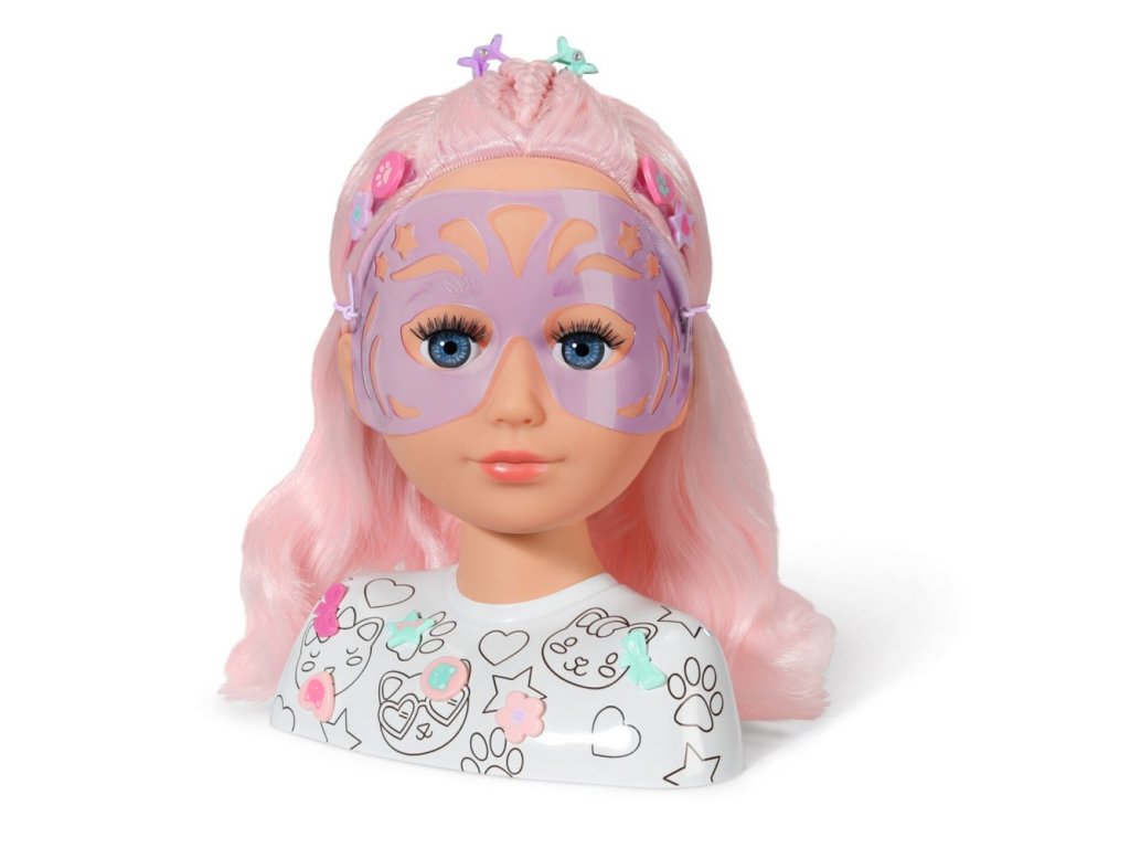 S BABY born Kreativní česací hlavou se fantazii a kreativitě meze nekladou. Česací hlavu vysokou 22 cm lze nalíčit a namalovat pomocí dodaných fixů a šablony. Ale to není vše: vybarvit lze i tričko panenky. Tričko můžete také dozdobit některými z 10 nacvakávacích ozdob. Zlatým hřebem jsou samozřejmě dlouhé růžové vlasy z vysoce kvalitního nylonu. Pomocí doplňků z balení lze vykouzlit ty nejúžasnější účesy. Čelenku do vlasů můžete také ozdobit barevnými nacvakávacími ozdobami.