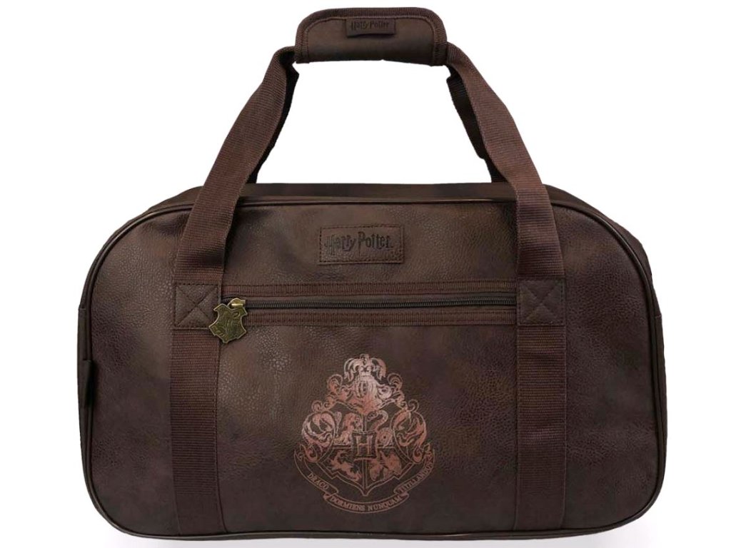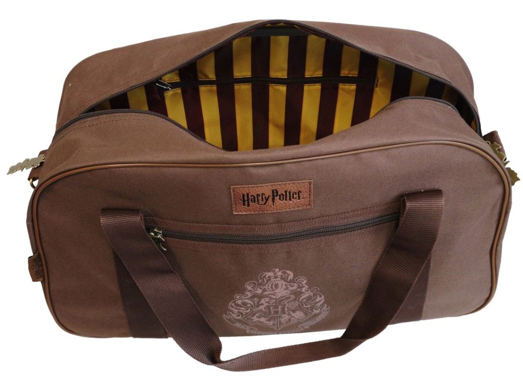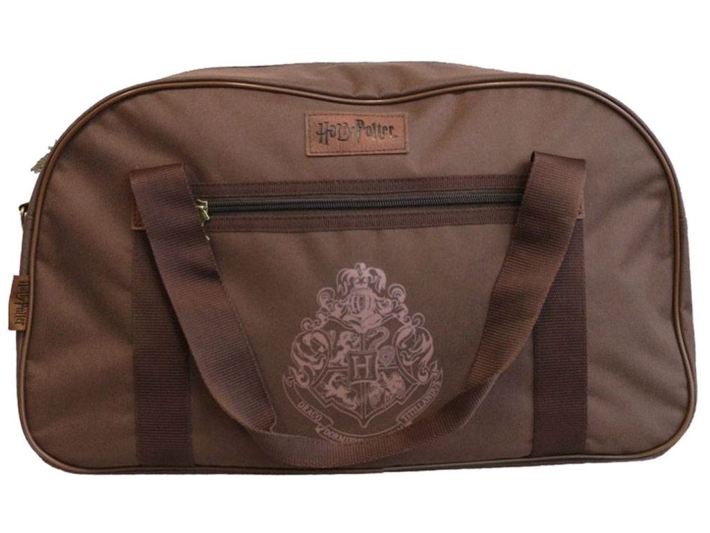 Praktická hnědá jednoprostorová cestovní taška s vrchním otevíráním a přední kapsou. Taška má motiv Hogwarts na přední straně,dvě uši na snadné nošení v ruce včetně jednoho většího popruhu pro snadné nošení na rameni.