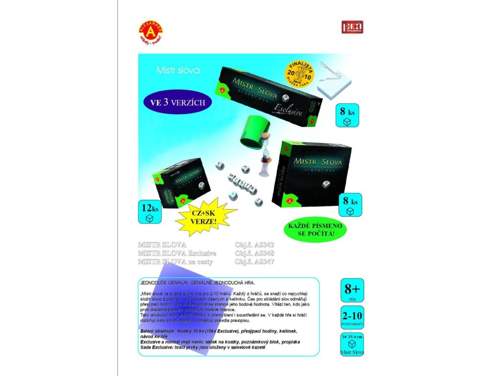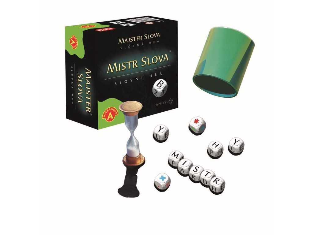 Slovní hra - menší, úsporné cestovní balení - Mistr slova je svižná slovní hra pro 2-10 hráčů. Hráči se snaží, v čase vymezeném přesýpacími hodinami, složit slovo z písmen na kostkách vržených z kelímku. Po složení slova se stanoví jeho bodová hodnota. Vítězí ten, kdo jako první dosáhne předem dohodnuté bodové hranice. Hra, přiměje účastníky přemýšlet i soustředit se. V každé hře si hráči rozšiřují svou slovní zásobu a osvěžují pravidla pravopisu. Nepotřebujte žádný hrací plán, nehrozí rozsypání písmenek při hře.