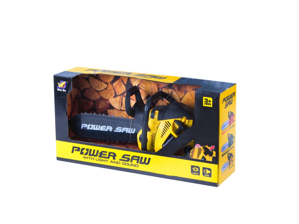 Plastová pila na baterie vydávající reálný zvuk. Má pohyblivý řetěz a její délka je cca 38 cm. Výrobek vyžaduje použití 3 ks baterií typu AA, které nejsou součástí.
