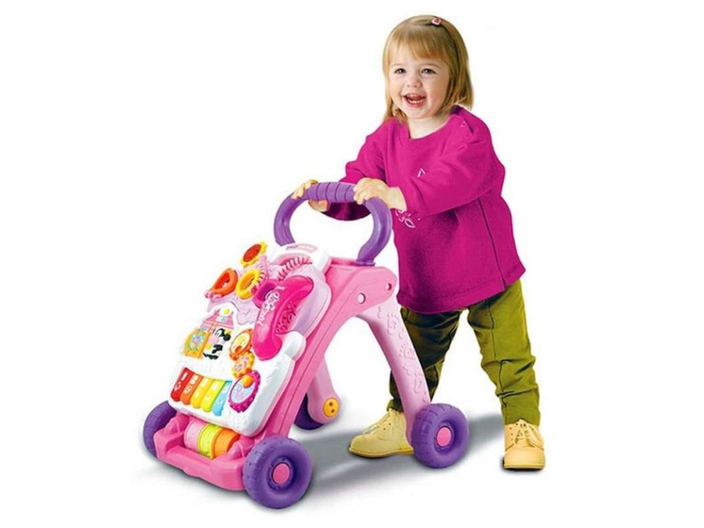 VTECH chodítko je součástí série hraček vyvinutých tak, aby rostly s dítětem od doby, kdy začnou sedět až do doby stabilní chůze. Nejdříve si mohou hrát s odnímatelným panelem na podlaze. Poznávají zvířátka, barvy, hudbu, tvary i čísla. Jakmile povyrostou, pak připnutý, důvěrně známý panel jim při chůzi dodává pocit bezpečí. Interaktivní panel chodítka nabízí 2 varianty hry, které lze libovolně přepínat pomocí posuvného tlačítka. První varianta nabízí možnost podvědomého učení a poznávání. Varianta druhá je více zaměřena na hudební cítění a zábavu. Vtech chodítko představuje dítěti první zvířátka a jaké zvuky zvířátka dělají. Učí ho poznávat barvy, podvědomě učí počítání, čísla i základy správného hudebního vzdělávání. Učí poznávat tvary a rozvíjí koordinaci očí s rukama. Podporuje manuální zručnost dítěte a správný vývoj hrubé i jemné motoriky. Úžasná stabilita, perfektně tvarovaná rukověť chodítka společně s možností nastavení brzdění koleček dává dítěti výjimečný pocit bezpečí při prvních krůčcích. Skvělou zábavu plnou poznávání nabízí telefonní sluchátko, otočná ozubená kolečka nebo barevné piáno. Vhodné od 9 měsíců.