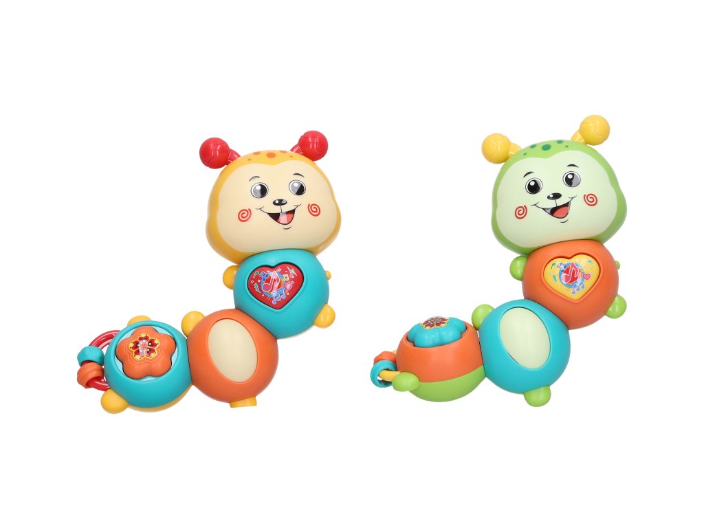 Chrastítko housenka s efekty. Velikost 14 cm. Vydává světelná a zvukové efekty (melodie). Display box 8 ks. 2 varianty - žlutá, zelená. Baterie 2xAAA nejsou součástí.