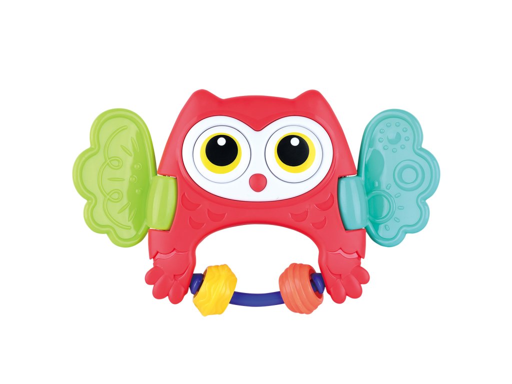 Sova zakrývající oči. Rozměry 18x2,5x11,5 cm. Pohybující skřípějící křídla, otáčející oči, 2 kroužky.