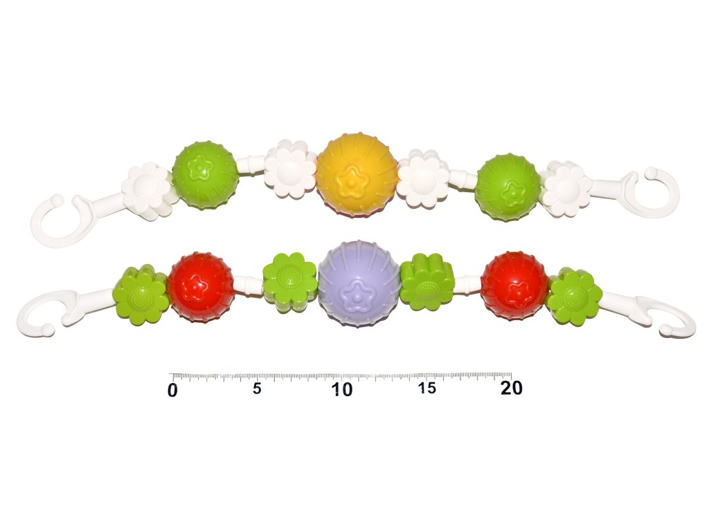 Řetěz na kočárek - kytičky, koule. Figurky z tvrdého plastu navlečené na mírně pružicím lanku jsou barevné a jednoduše tvarované (stačí umýt v mýdlové vodě). Snadno se připevní na kočárek. Jsou vyrobeny ze zdravotně nezávadných materiálů podléhajícím přísným hygienickým normám. Barevné varianty - bílá, mentolová, modrá, růžová.