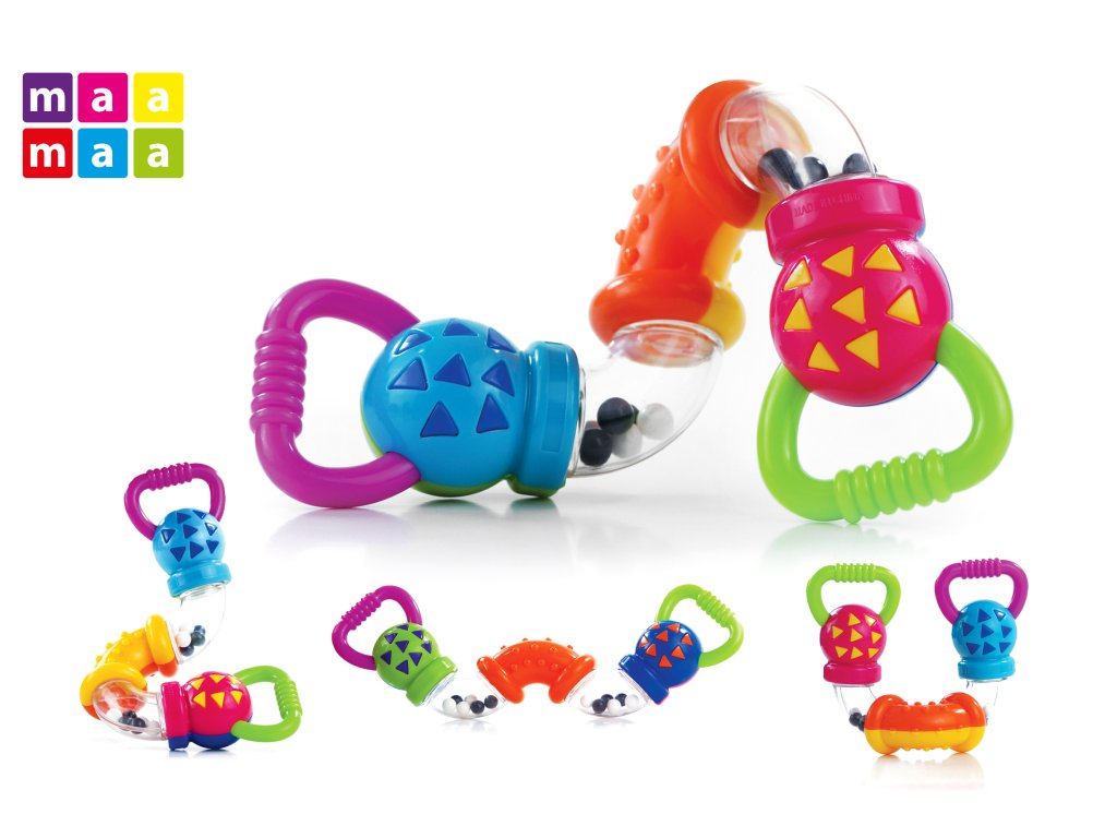 Chrastítko se skládá z různobarevných trubiček, které se dají otáčet. Při otáčení vzniká chrastivý zvuk. Hrkávka hrká také díky kuličkám, kterými je naplněna. Hračka má pohodlné úchyty. Velikost: 17x11cm