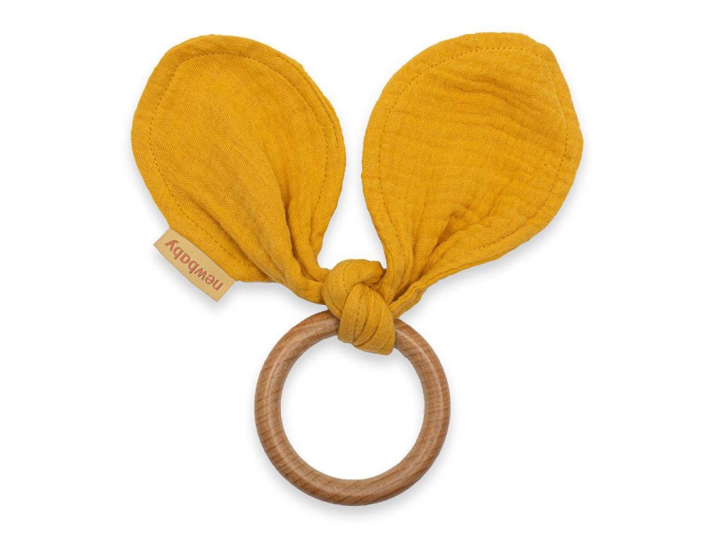 Kousátko ouška New Baby Ears mustard. 100% organická bavlna.100% bukové dřevo. Celková délka: 14,5x10 cm. Rozměry kroužku: 7 cm.