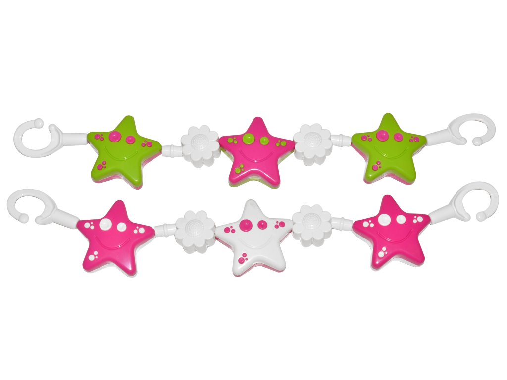 Řetěz na kočárek - hvězdy, kytičky. Figurky z tvrdého plastu navlečené na mírně pružicím lanku jsou barevné a jednoduše tvarované (stačí umýt v mýdlové vodě). Snadno se připevní na kočárek. Jsou vyrobeny ze zdravotně nezávadných materiálů podléhajícím přísným hygienickým normám.