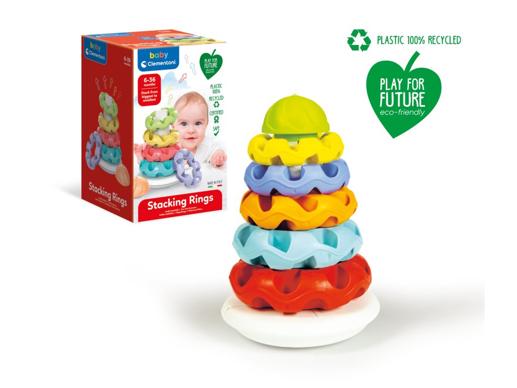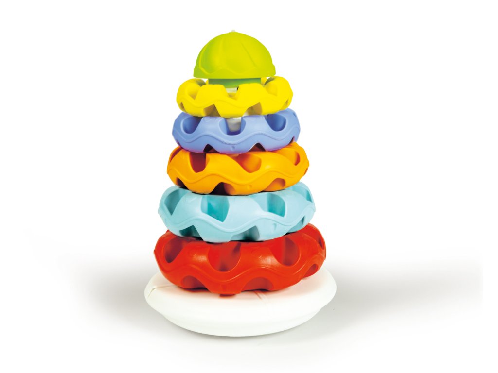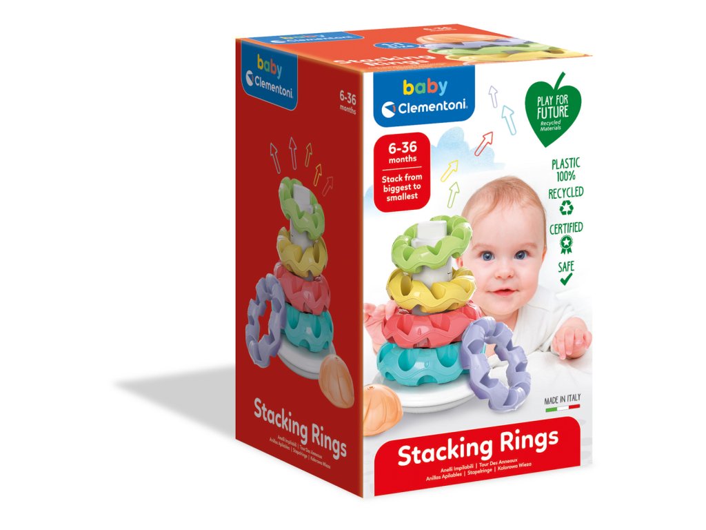 5 barevných kroužků různých velikostí, které se dají naskládat na kolébku. Kroužky jsou vyrobeny s různými povrchy, aby stimulovaly hmatové vnímání dětí od prvních měsíců života. Podporuje rozvoj manuálních dovedností a zrakového vnímání. Stimuluje dítě k rozpoznávání barev, tvarů a velikostí a vztahů příčin a následků. Rozměry balení: 15 x 15 x 24cm. Věk: 6m+